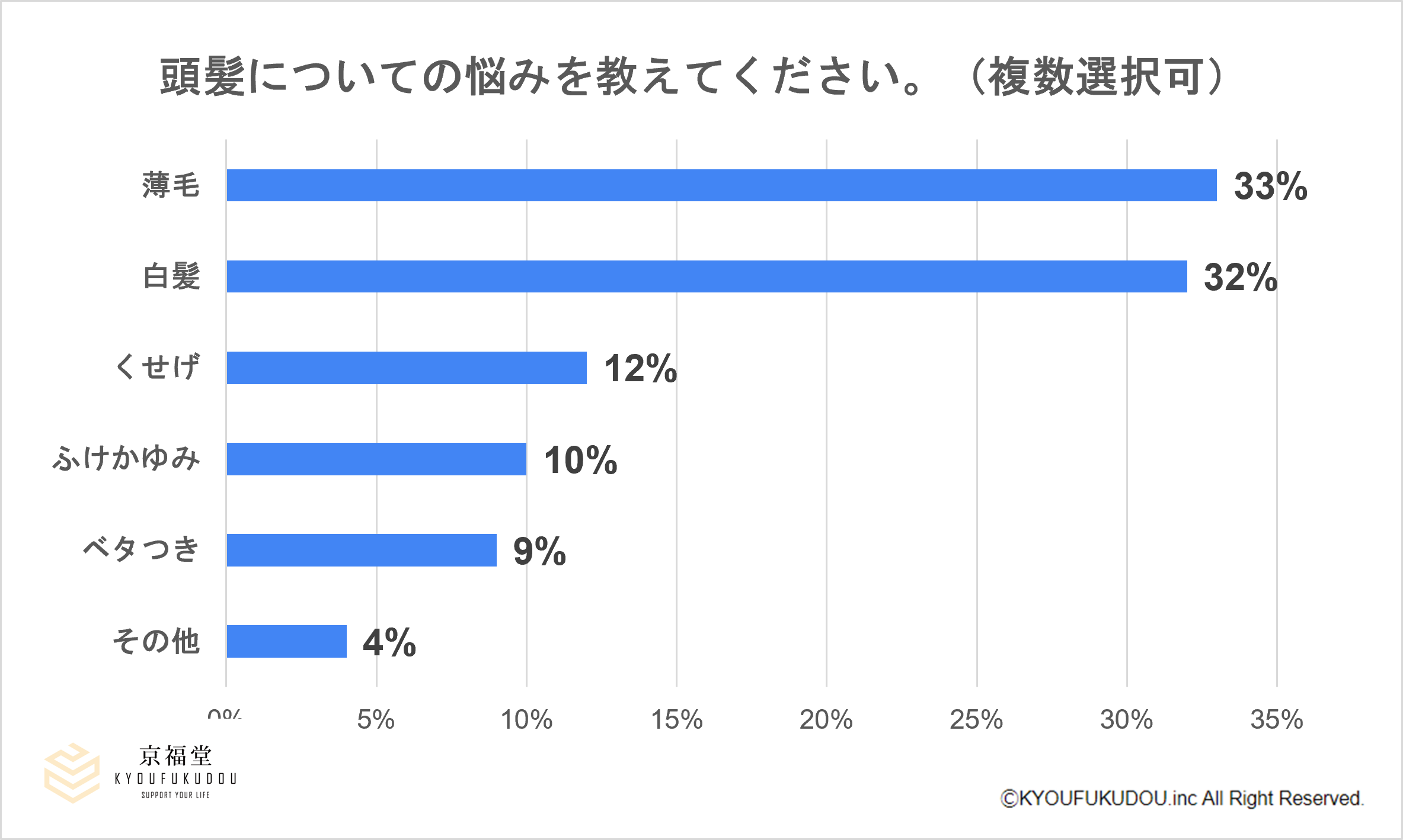 回答は、一番多いのが「薄毛」、次に多い回答が「白髪」という結果になりました。