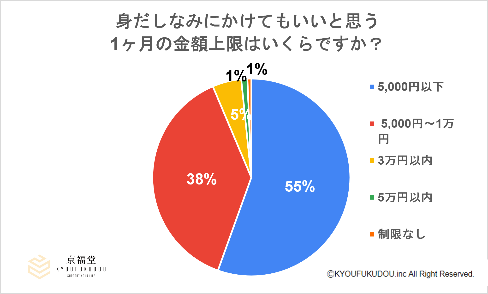回答は、「5,000円以下」が55%で、次に多かったのが「5,000円〜1万円」で38%でした。