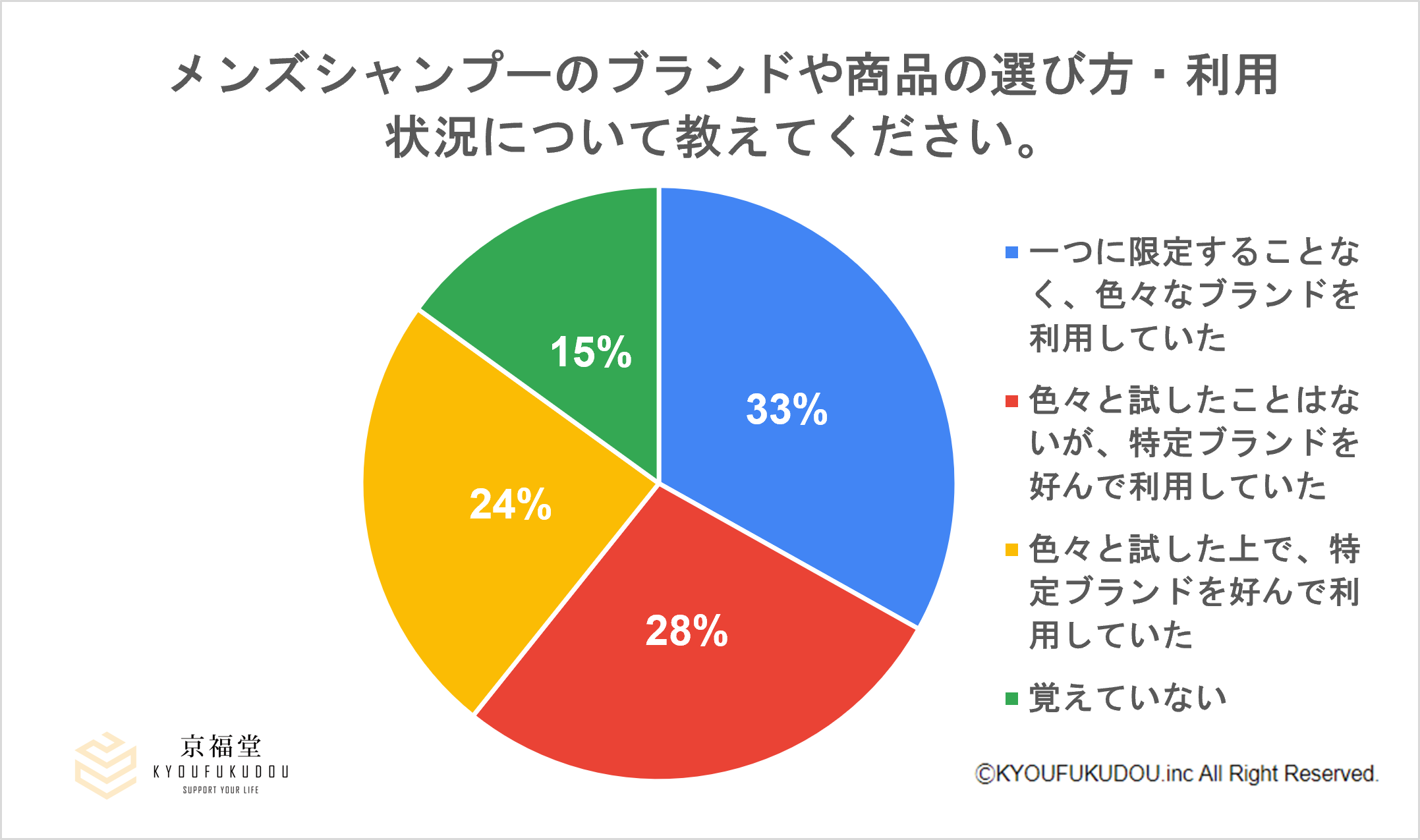 回答は、「1年以内一つに限定することなく、色々なブランドを利用していた」が33%で、次に多かったのが「薄毛について悩んでいる期間は2年以上色々と試したことはないが、特定ブランドを好んで利用していた」で28%でした。