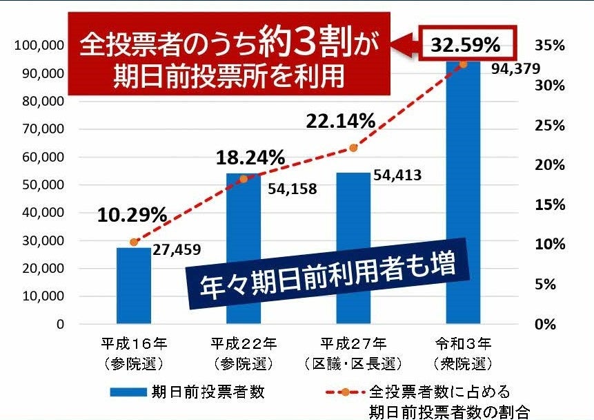 目指せ投票率アップ!大型ショッピングモールでの期日前投票所オープン、13箇所への期日前投票所増設、当日投票所の増設