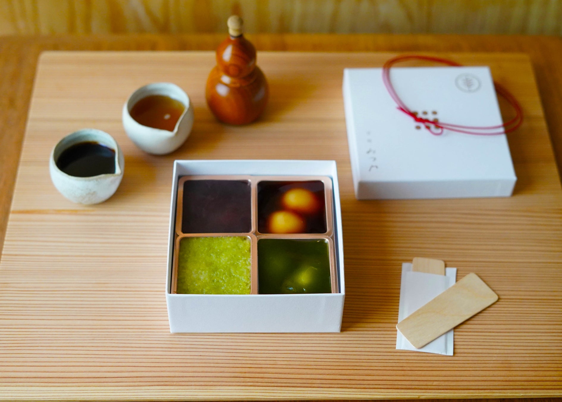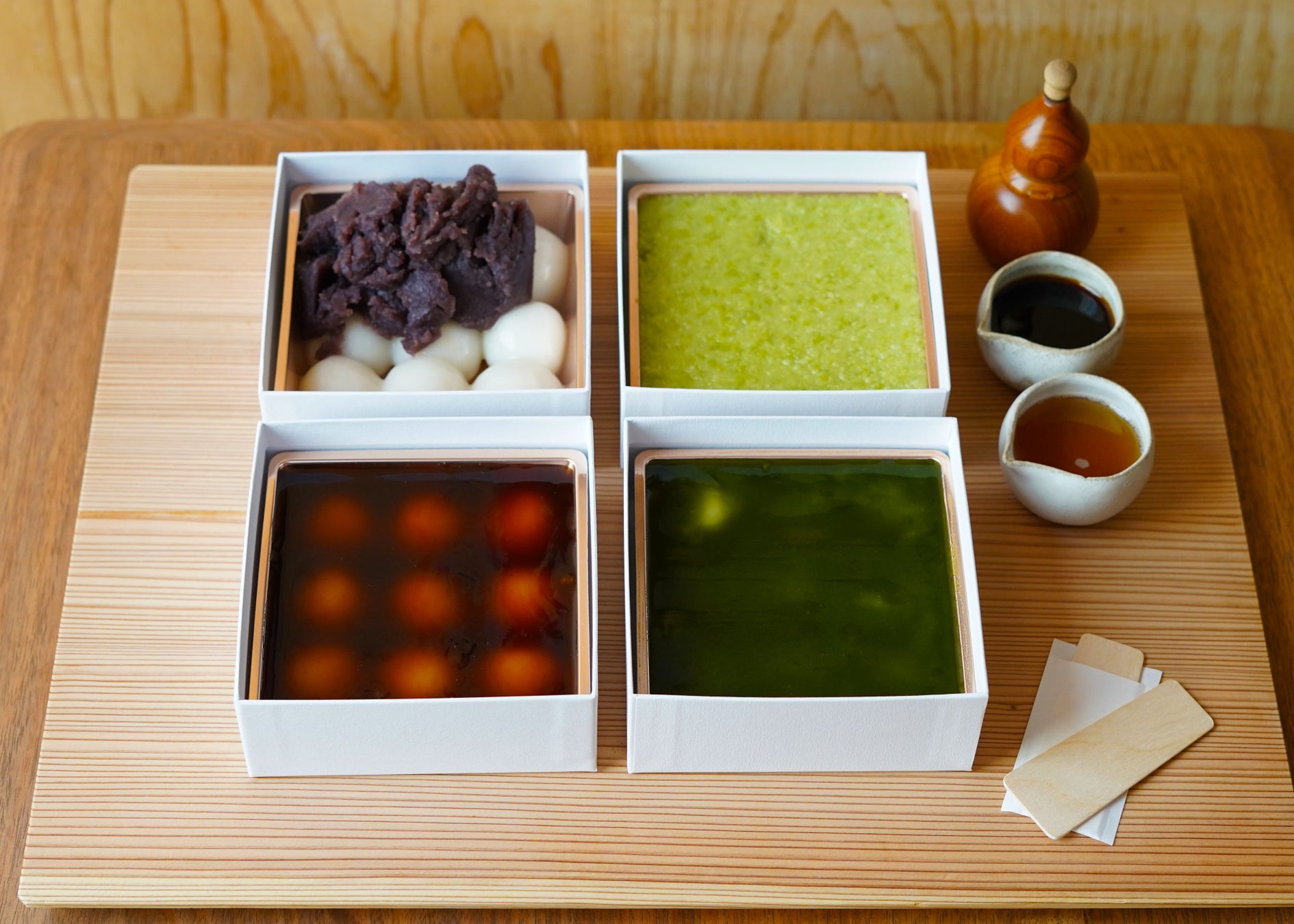 もっちもちの白玉の上に素材にこだわった5種類の味が楽しめ、味ごとに専用のみつや調味料が付きます。