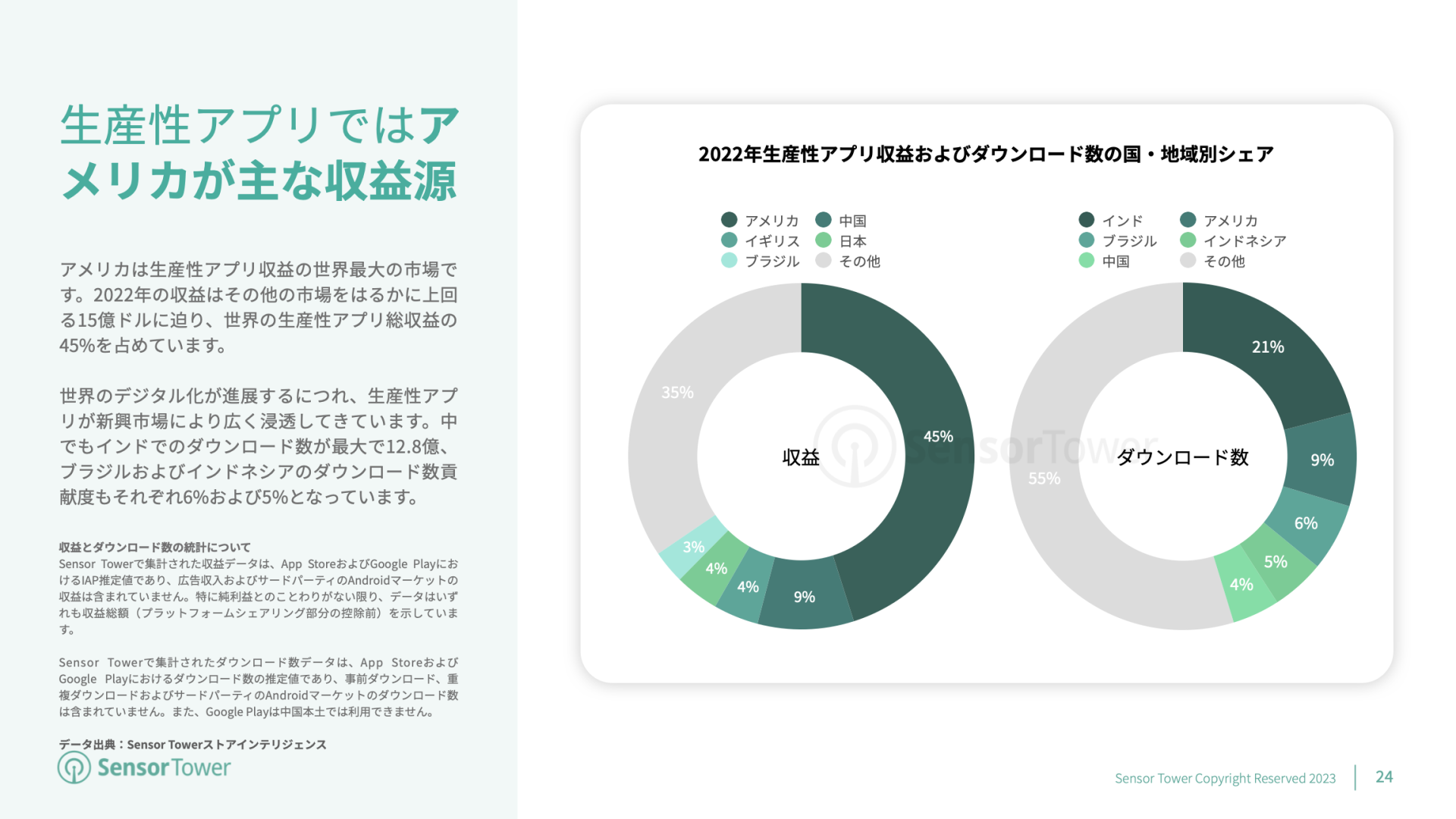 アメリカは生産性アプリ収益が世界で最大の市場です。2022年の収益はその他の市場をはるかに上回る15億ドルに迫り、世界の生産性アプリ総収益の45%を占めています。