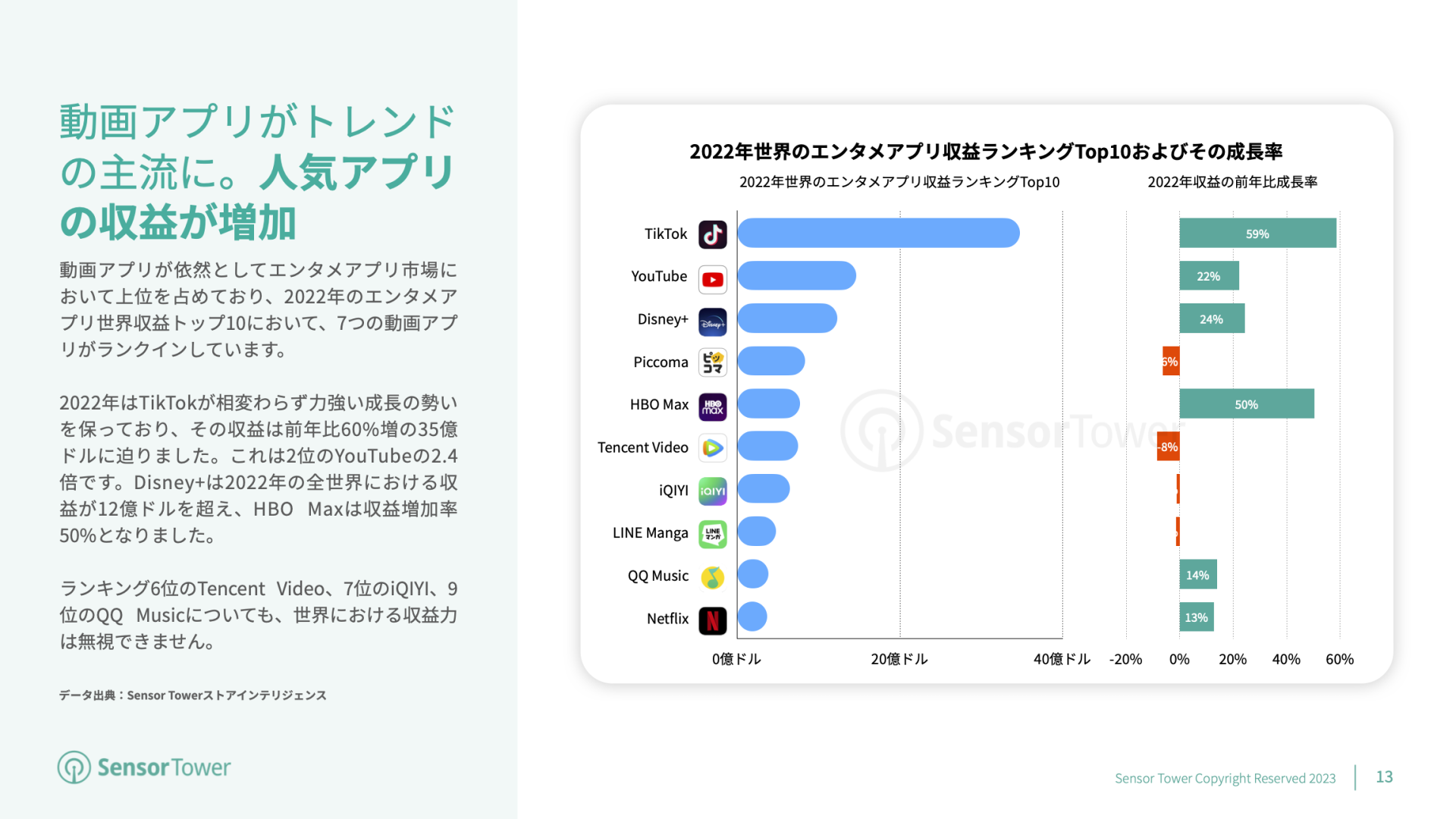 2022年のエンタメアプリ世界収益トップ10において、7つの動画アプリがランクインしています。モバイルエンタメ分野では、オンライン動画が依然としてトレンドの主流であり続けています。TikTok、YouTube、Disney+、HBO Maxなどの人気アプリは、2022年世界収益がいずれも増加しており、中でもTikTokの世界収益は前年比約60%増の35億ドルとなっています。