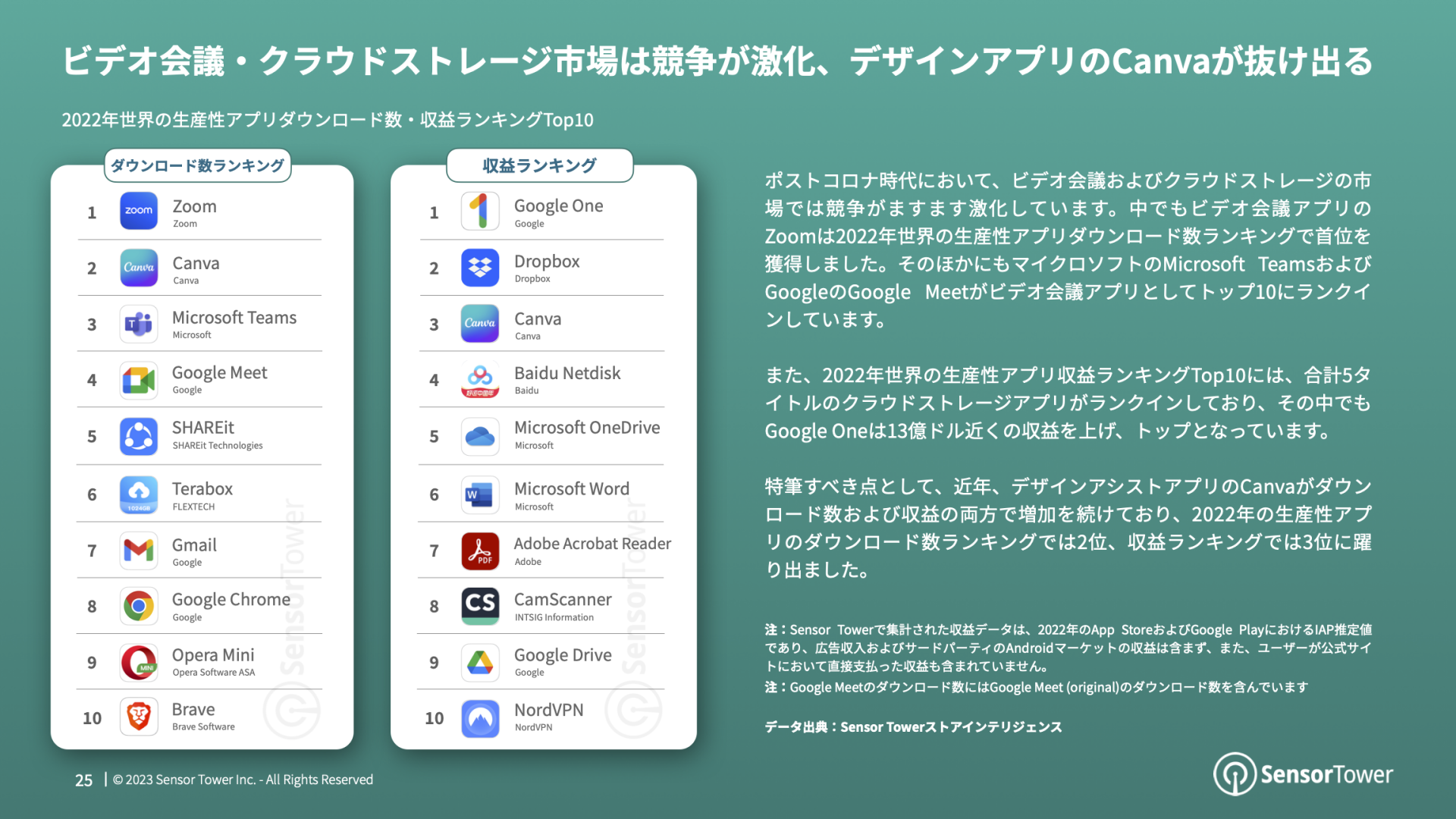 ビデオ会議およびクラウドストレージの市場では競争がますます激化しています。ビデオ会議アプリZoomは2022年世界の生産性アプリダウンロード数ランキングで首位を獲得しました。2022年世界の仕事効率化アプリ収益ランキングでTop10には、合計5タイトルのクラウドストレージアプリがランクインしています。