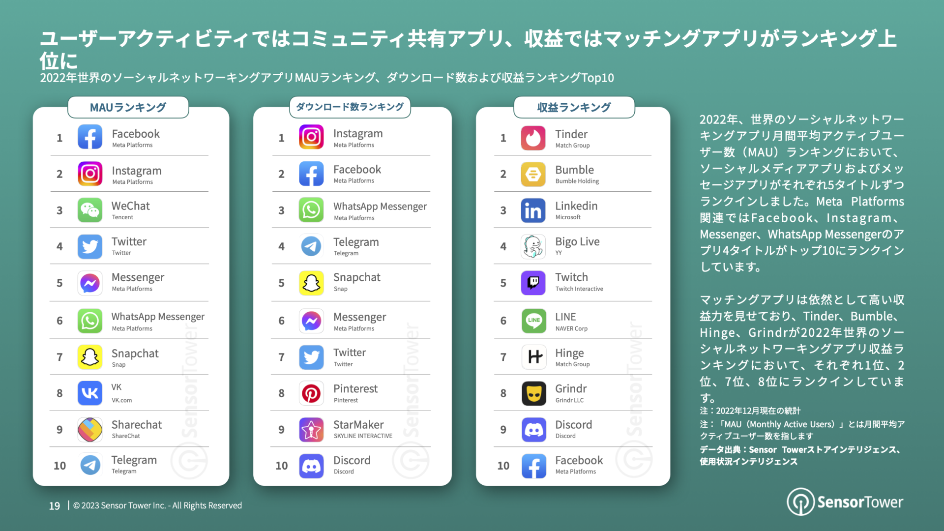 マッチングアプリは依然として高い収益力を見せており、Tinder、Bumble、Hinge、Grindrが2022年世界のソーシャルネットワーキングアプリ収益ランキングにおいて、それぞれ1位、2位、7位および8位にランクインしています。