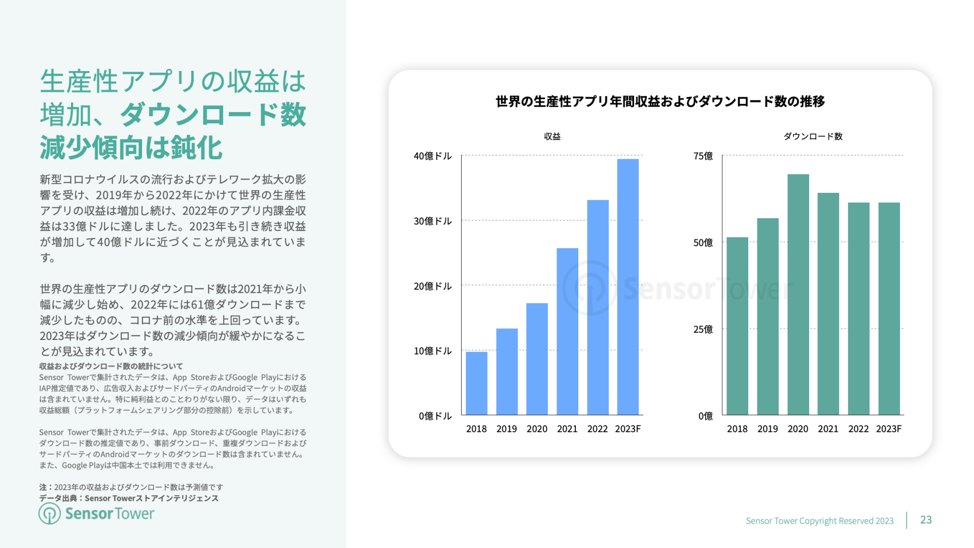 新型コロナウイルスの流行およびテレワーク拡大の影響を受け、世界の生産性アプリの収益は増加し続け、2022年には33億ドルに達しました。2023年も引き続き収益が増加して40億ドル近くになることが見込まれています。世界の生産性アプリダウンロード数は2021年から小幅に減少し始めていますが、2023年はダウンロード数の減少傾向が緩やかになることが見込まれています。