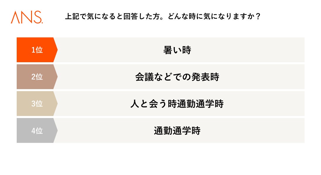 ANS.では、シミ肝斑治療やニキビ治療といった肌悩みに特化した治療メニューを展開していましたが、これまでユーザー様より多汗症(脇汗)に関する悩み相談の声を多く寄せられることがありました。そこで多汗症(脇汗)治療を開始するにあたり、ユーザー様へアンケートを実施いたしました。