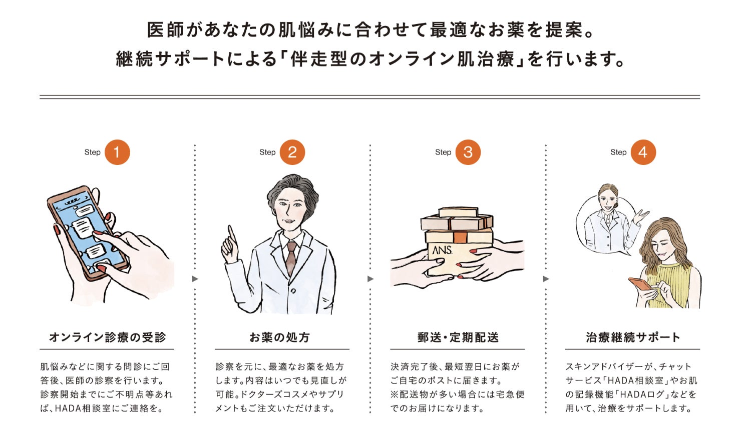 「ANS.」は、自宅で叶うオンライン肌管理サービスです。スマホ一つで医師によるオンライン診療を受けていただき、ユーザー1人ひとりの肌悩みや目指したい肌に応じたお薬や基礎化粧品、サプリメントを、毎月ご自宅にお届けするのが特徴です。