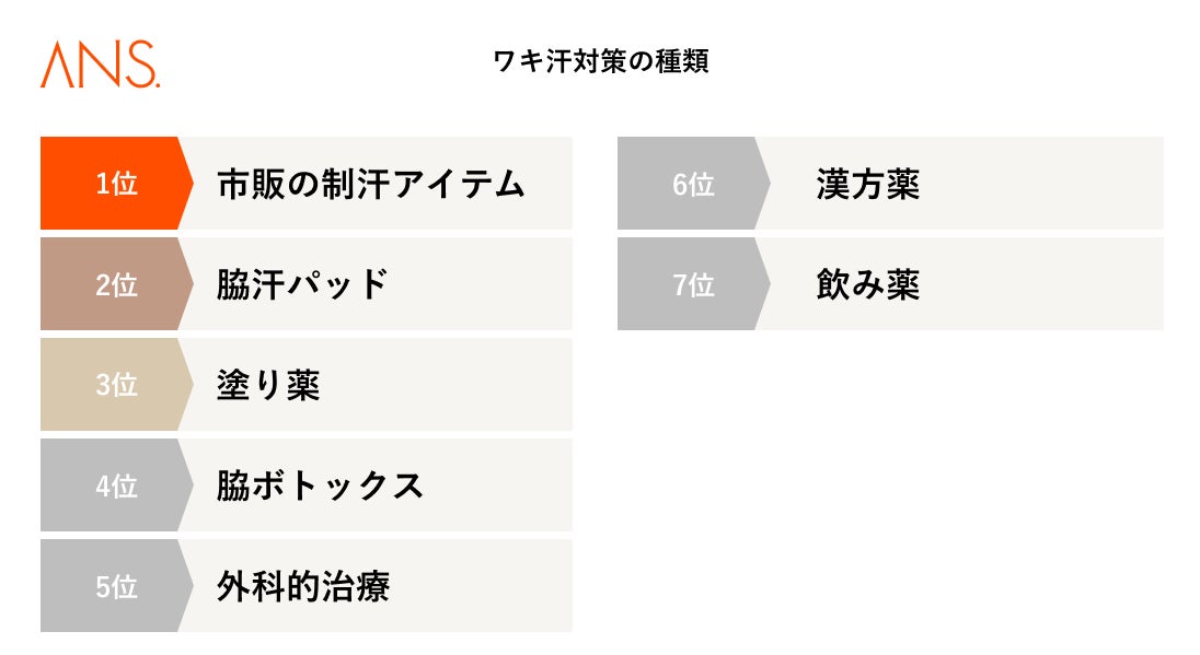 脇汗対策の調査では、1位「市販の制汗アイテム」、2位「脇汗パッド」、3位「塗り薬」が選ばれており、外科的治療に比べて負担が少ないアイテムが選ばれる傾向にあるということが推察できます。