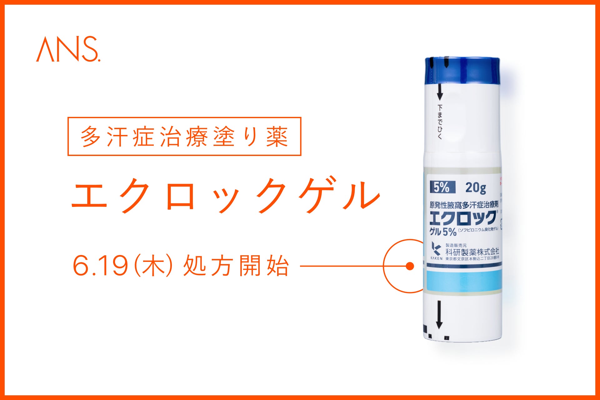 現在、多汗症の治療法は様々ありますが、ANS.では初めての方でも気軽に、そして負担なく治療ができるよう、塗り薬の「エクロックゲル5%」を提案いたします。ANS.で提案する治療法で一緒に悩みを解決していきましょう。