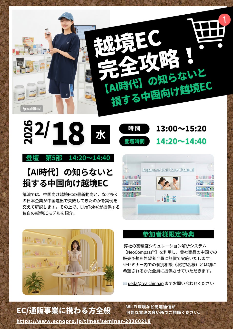 2026年2月18日(水)13:00~15:20に、7人の越境ECのプロがオンラインセミナーで順に登壇。