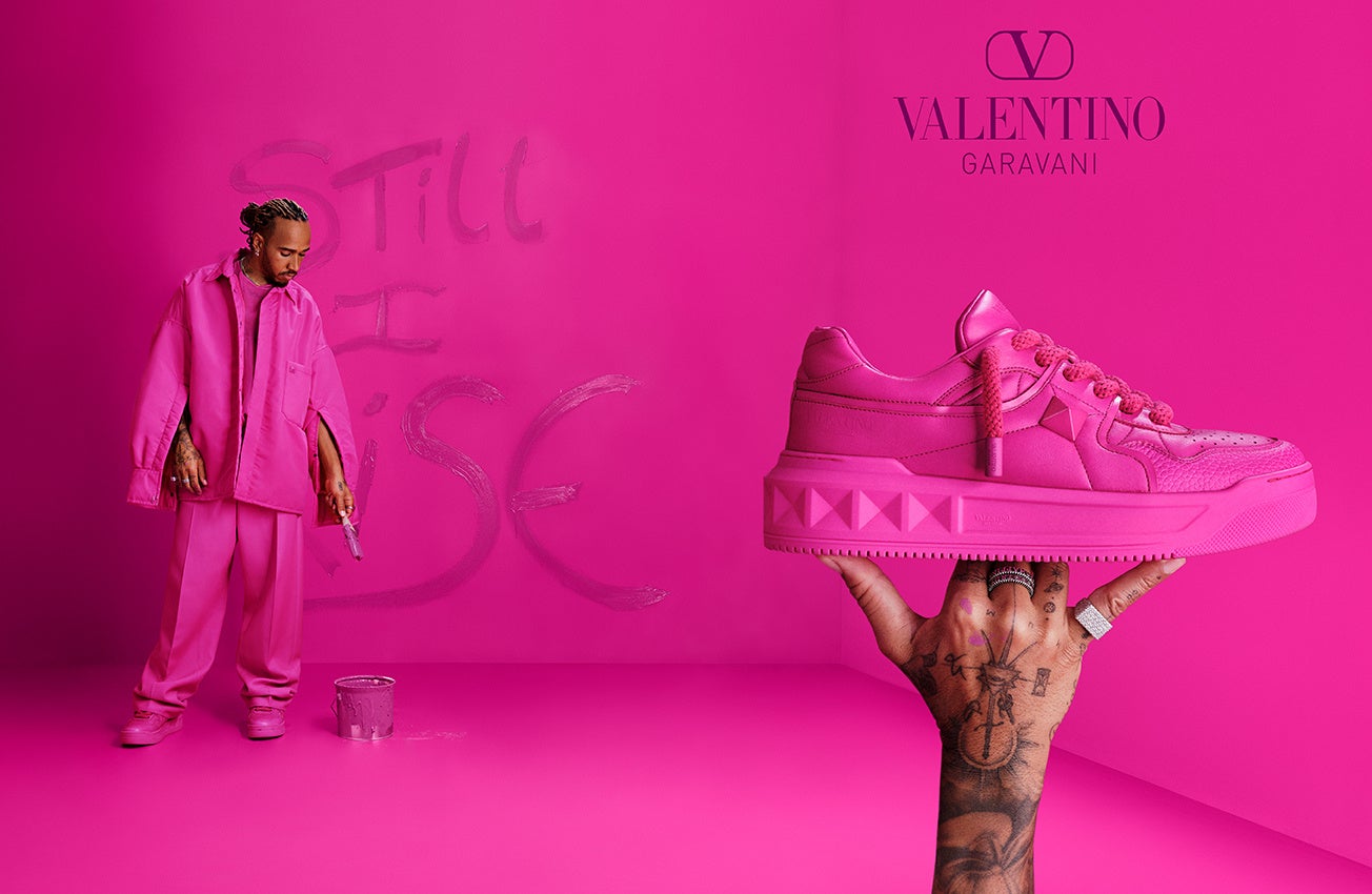 メンズの広告キャンペーンにおいては、写真家のニコラス・カーンが、マニフェストが手書きされたパーソナルなピンク一色の背景の中で、思慮深く象徴的なポーズをとるハミルトンの姿を撮影しました。あらゆるルールから解き放たれニュートラルなカラーとなったピンクは、ファッションのサインを再構成する可能性を秘めています。それは明晰夢であり、インクルーシブでコミュニティの一部になるということ。ヴァレンティノのメンズ広告キャンペーンにおいてハミルトンは、スポーツで見せる一面とは異なる、メゾンのすべてのバリューを体現する姿を見せています。