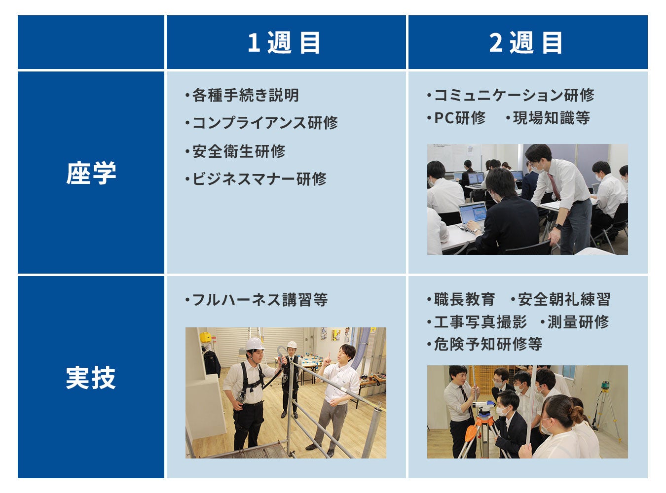 現場を再現した実技研修施設での実技研修を多く取り入れ、建設現場での1日の流れや作業着・保護具の着用方法、作業工程や建築資材の把握など現場の基本から体験できます。実際に現場で使用されている設備や道具を設置し、建設現場をイメージできるようにしています。さらに、現場で働くために必須のフルハーネス型安全帯(墜落制止用器具)に関する特別教育注1も入社時研修で受講するので修了証も受領できます。