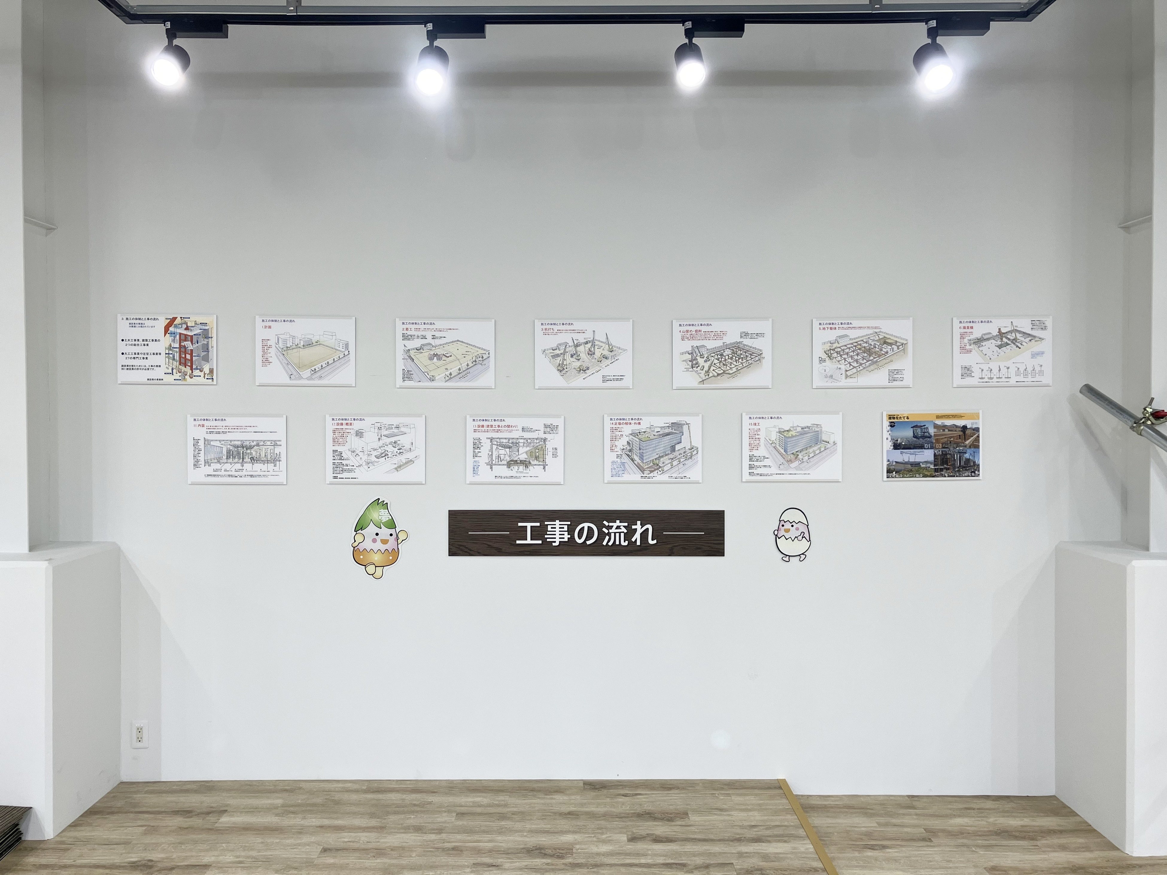 工事の流れは、現場に出るうえで非常に重要な知識です。施設内の壁に説明パネルを設置することで、研修生は受講後も、おさらいしたいときに閲覧できるようになりました。