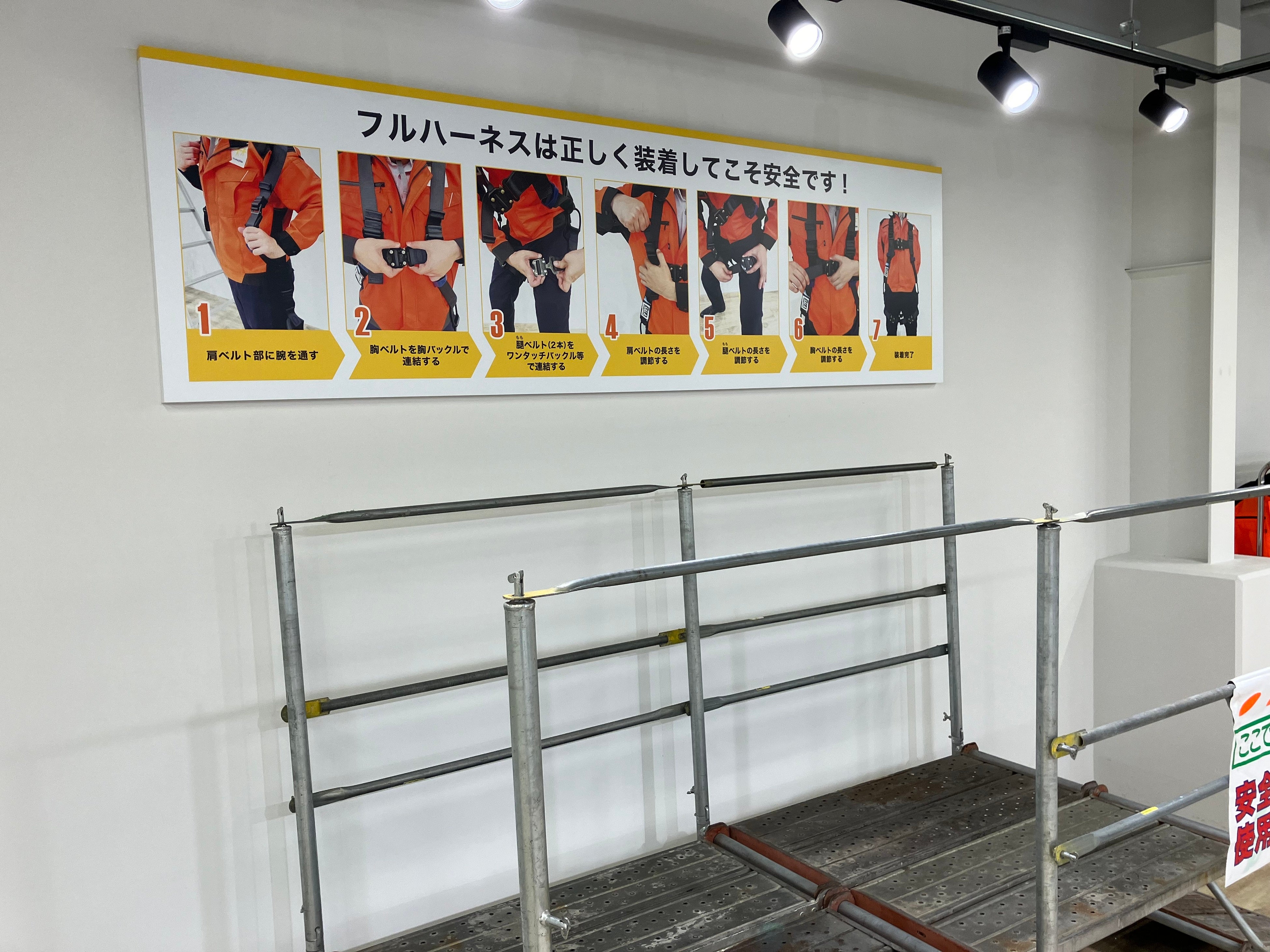 フルハーネス講習の説明パネルを設置することで、研修生は説明を受けつつ、パネルを参照しながらフルハーネスを着用することが可能になりました。