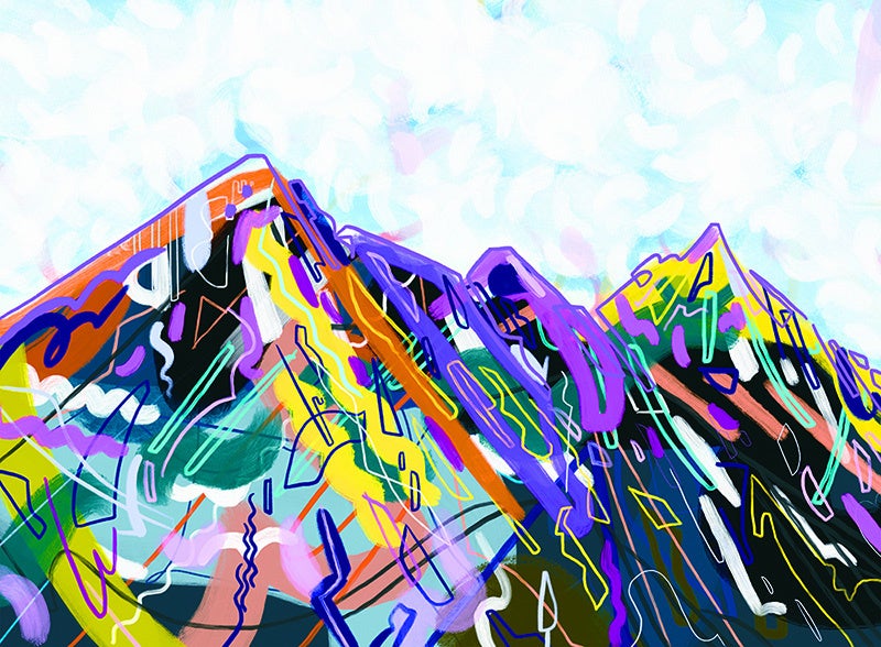 天候や山のフォルム、時間帯でさまざまな表情を魅せる山に惹かれ、山になるまでの、大地が蓄積していく過程を表現するために、意図せずに書き連ねた面と線画の積み重なりを、空との境目で山のフォルムに仕上げていく工程で描いています。