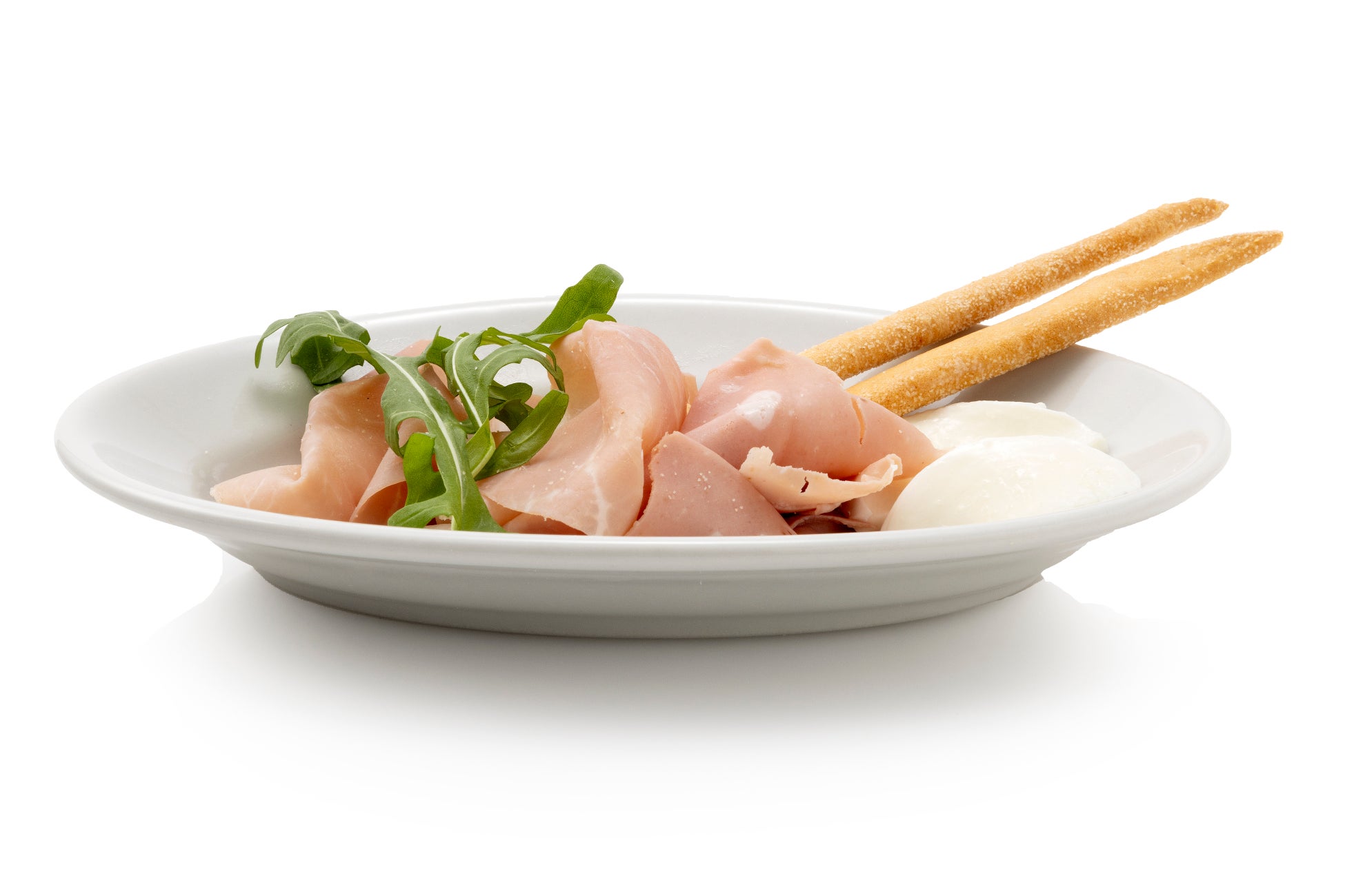 モルタデッラ、コット、モッツァレラ、グリッシーニ、ルーコラの盛り合わせ。春らしいロゼワインとの相性が素晴らしいです。