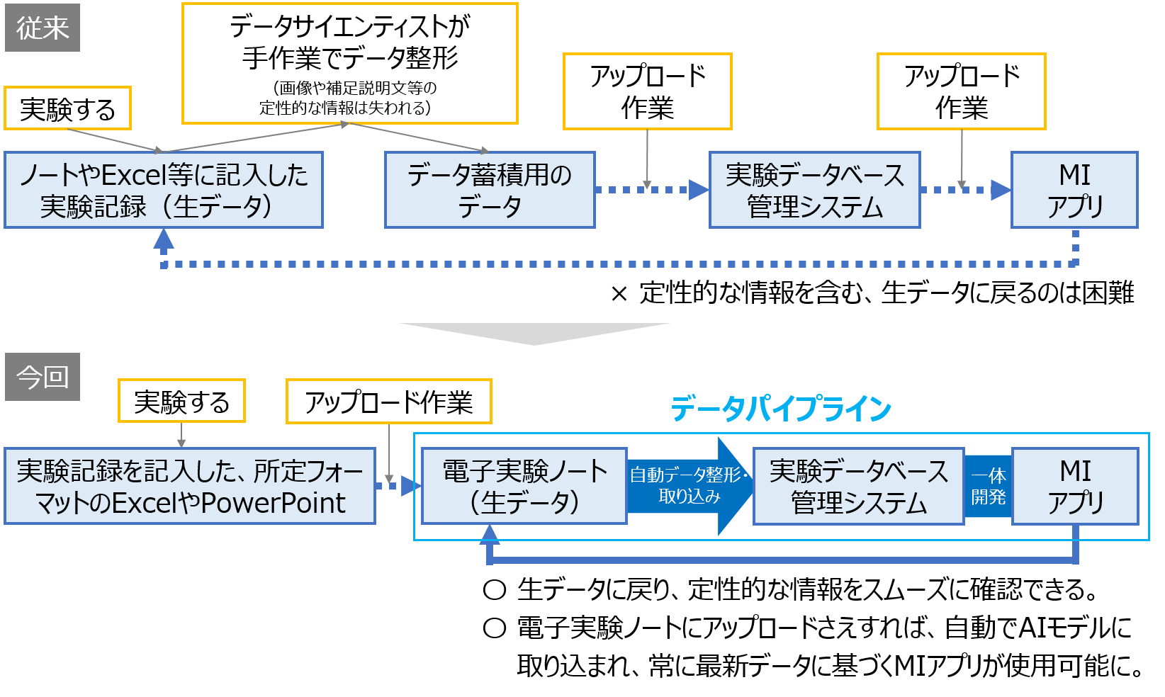電子実験ノートを活用することで、従来はAIモデル構築時のデータ整形作業で失われてしまっていた定性的な情報も見ることが可能になりました。MIアプリを管理するデータサイエンティストがAI予測結果に疑問を持った場合、容易に生データまでさかのぼって確認しデータの異常等をより素早く発見できるようになります。また、以前構築したMLOps(機械学習オペレーション)*1を活用して、電子実験ノートに入力した情報を自動でAIモデルに取り込む機能も実装しており、研究開発者は、常に最新のデータを反映した精度の高いMIアプリを使用することが可能となりました。