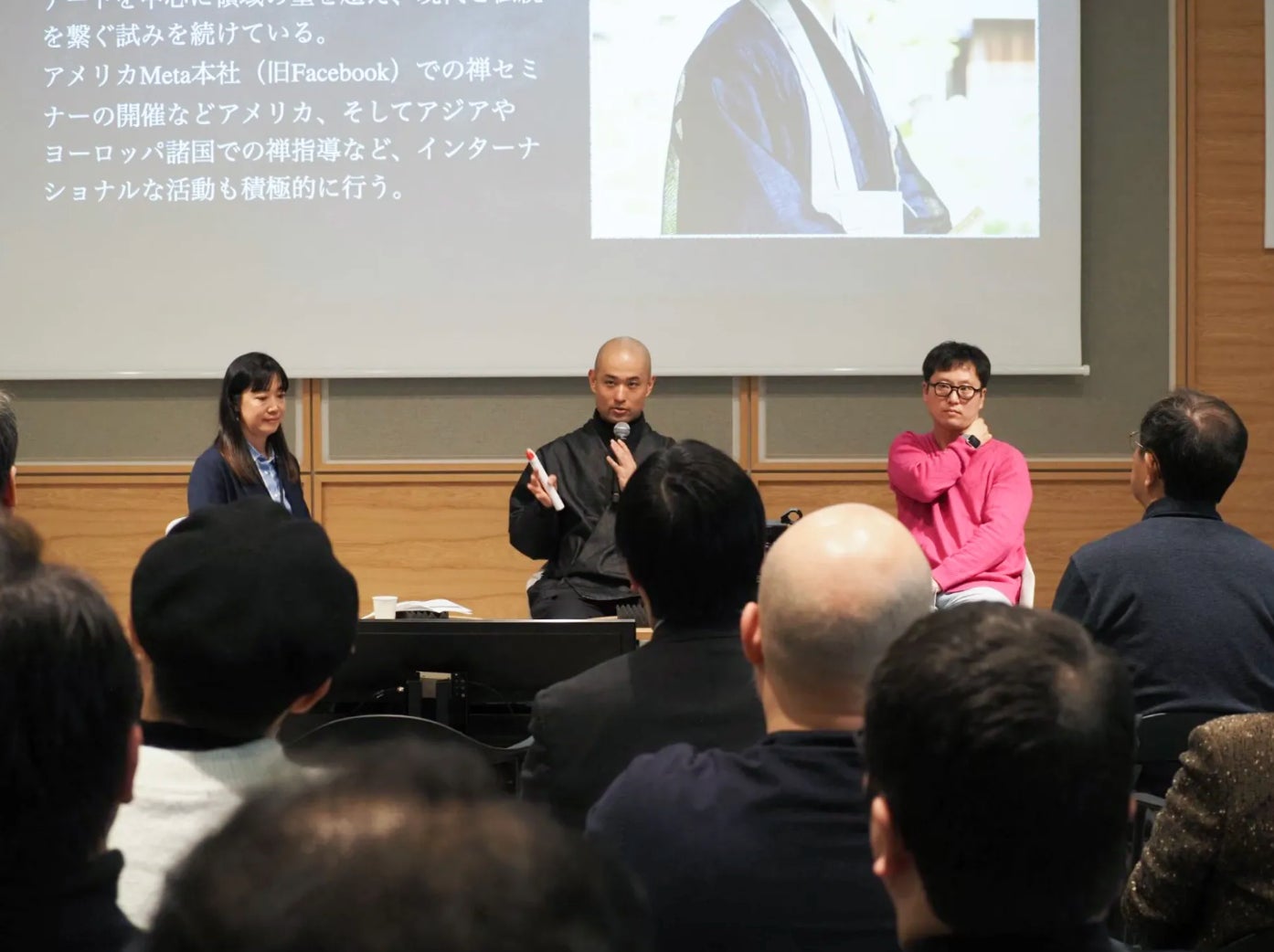 記念イベントでは、特別ゲストとして京都「両足院」副住職 伊藤 東凌氏と、「田尾企画 編集室」代表 田尾 圭一郎氏を迎え、アートと禅の視点から「心の幸せ」について対談を行いました。アートを通じた自己表現の重要性や、禅の哲学が日々の暮らしに与える影響について語られ、参加者からも活発な質問が寄せられました。