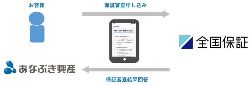 穴吹興産社のモデルルームに来場された顧客が全国保証の本サービスにアクセスし、審査に必要な情報を入力すると、申込データがAPIにより全国保証のシステムに取り込まれます。全国保証はそのデータを基に住宅ローン保証審査を行い、審査結果の回答を行うものです。