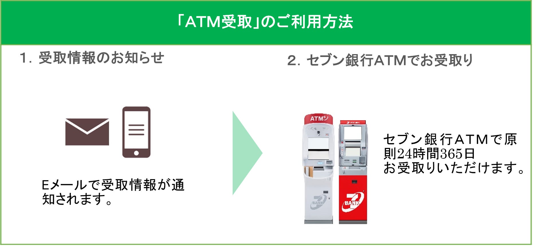 セブン・ペイメントサービスが提供する「ATM受取」とは、「企業」から「個人」への送金をセブン銀行ATMとセブン‐イレブンのレジで、原則24時間365日現金や電子マネーで受取ることができるサービスです。