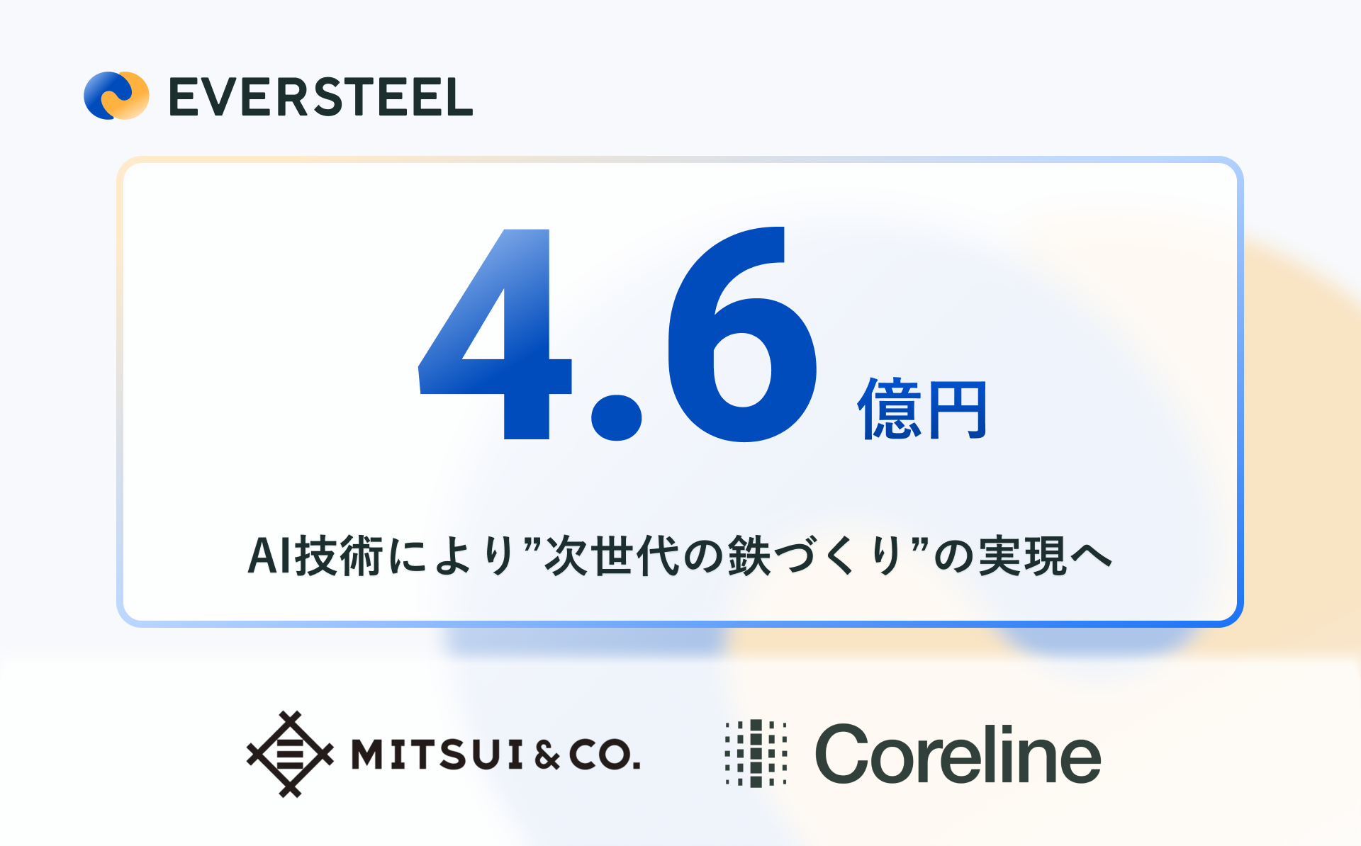 株式会社EVERSTEEL(本社:東京都文京区、代表取締役:田島 圭二郎、以下「EVERSTEEL」)は、このたび三井物産株式会社(本社:東京都千代田区、社長:堀 健一、以下「三井物産」)、Coreline Ventures(本社:米国カリフォルニア州、以下「Coreline」)よりシリーズAラウンドの資金調達が決定いたしましたので、お知らせいたします。本資金調達により、当社が展開する「鉄ナビ検収AI」をはじめとするDXプラットフォーム「鉄ナビ」シリーズの更なる拡張と、鉄鋼業界における脱炭素化の促進・業務効率化の加速を図ってまいります。