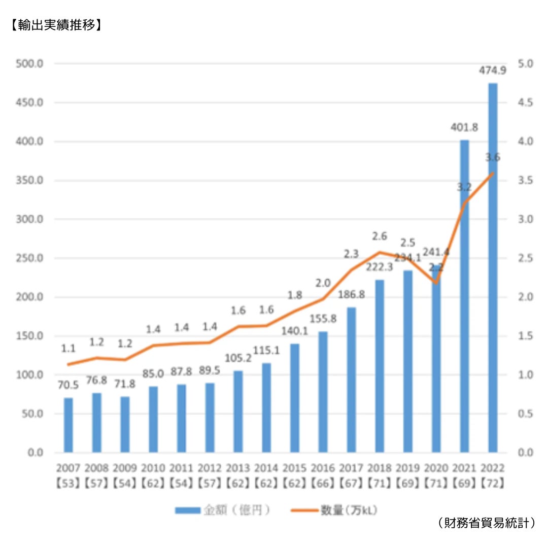 最近では“SAKE”として世界中で通じるほど、日本酒の人気は目覚ましいものがあります。中国やアメリカを中心に、最近ではフランス、香港などでも人気が高まっており、2022年には日本酒輸出総額474.92億円、数量も35,895㎘に達しており、13年連続で前年を上回っております。