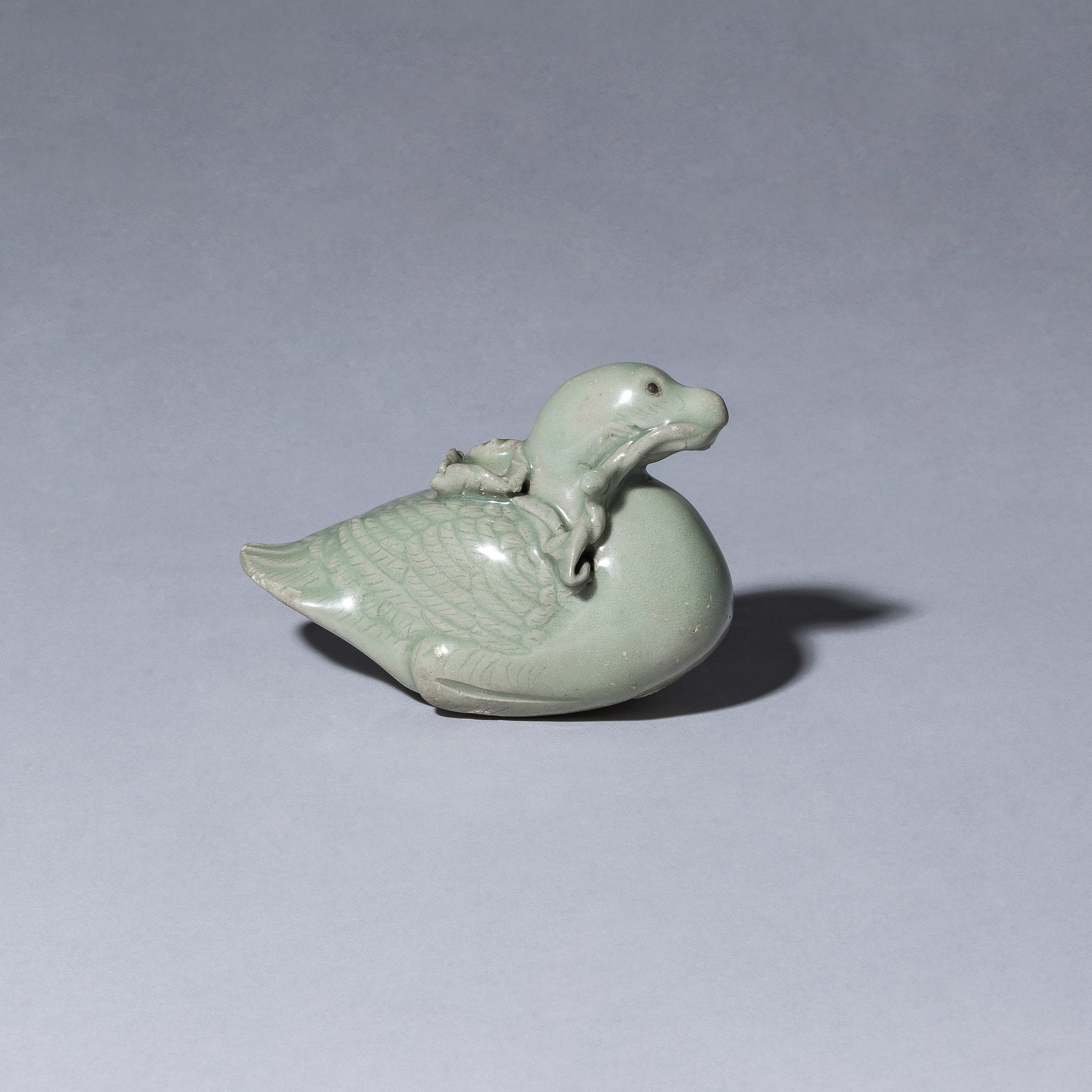このうち「李朝染付盆栽花鳥文壷」は 18世紀の作品で、大きさがありながら破綻なく美しい形姿に、盆栽に小禽という珍しい意匠が施された傑作です。また、12世紀に作られた「高麗青磁鴨形水滴」は蓮茎を咥えた鴨を象った瀟洒な作品です。動植物の姿を模した象形青磁は、高麗独自の美感を高い技量で表した高麗青磁の達成の一つに数えられ、同意匠の水滴は韓国の国宝に指定されております。以上の2点をはじめとした高麗・李朝の陶磁器を中心に、華角張の箱など多彩な作品を取り揃えております。