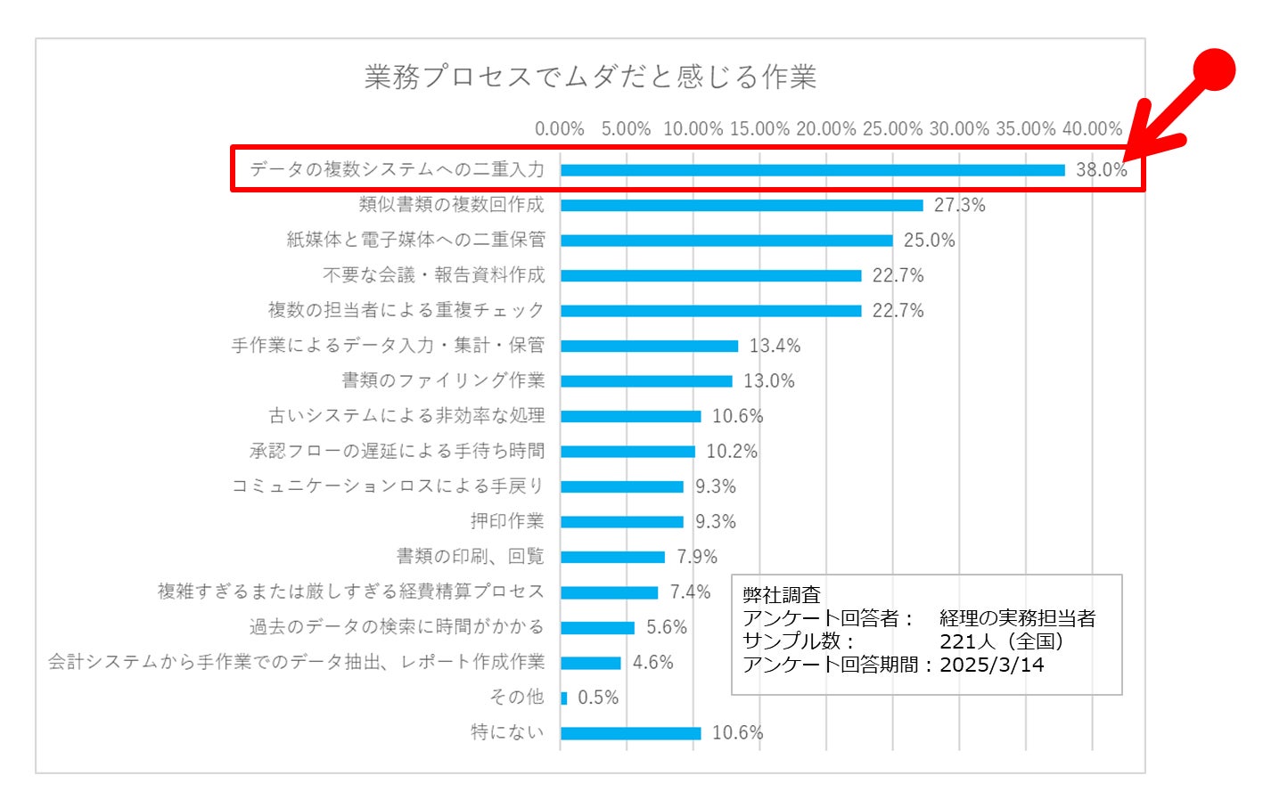NTTデータビジネスブレインズが行った企業の経理実務担当者へのアンケート調査では、業務プロセスで無駄だと感じる作業の1位は「データの複数システムへの二重登録」という結果が出ています。
