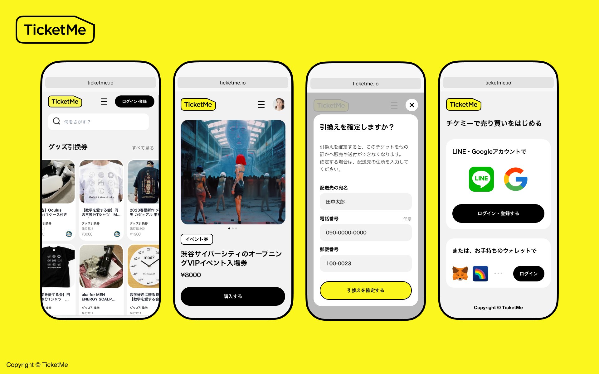 TicketMe(チケミー)では、それらの「商品を受け取る権利」や「イベントに参加する権利」を『チケット』として自由に売り買いすることが可能です。商品の受け取りや、イベント参加の確定前に『チケット』を自由に二次流通することができ、二次流通の利益の一部は一次販売者に還元される仕組みとなっています。
