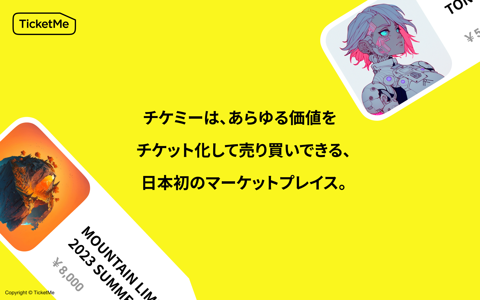 この度、株式会社チケミー (本社:東京都文京区、代表取締役社⻑:宮下 大佑、以下チケミー )は、2023年5月1日に、あらゆる「モノ」や「権利」が誰でも簡単に売り買いできる日本初のマケプレ(マーケットプレイス)アプリ「TicketMe(チケミー)」のサービスを2023年5月1日より正式リリースいたしました。