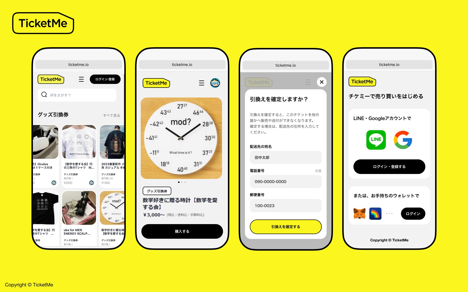 チケミーでは、モノや権利の売買はすべてそれらに紐づいたオンライン上の『チケット』を用いて行われ、受け取りや利用が確定されるまで、実際の商品の配送等はありません。