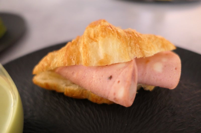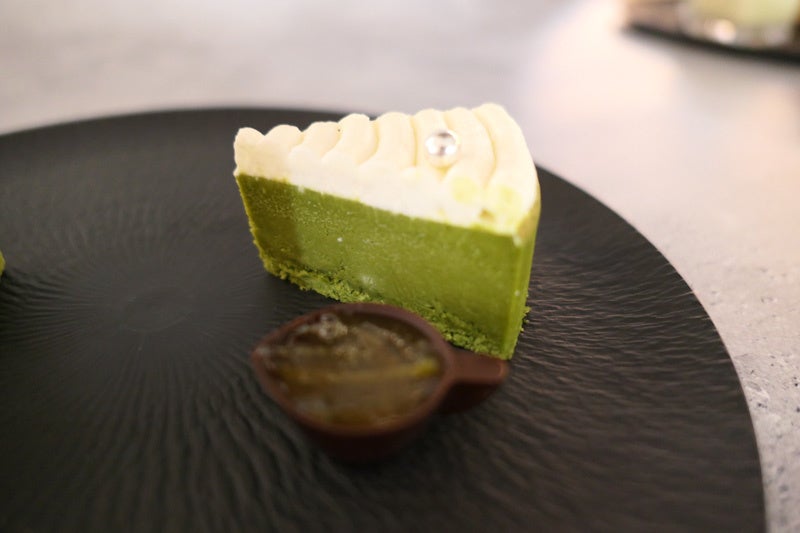 1段目のトレーには緑が目を惹く静岡県の素材がラインナップ。静岡抹茶のショートケーキ、ムース、クッキーと静岡産メロンのゼリー。