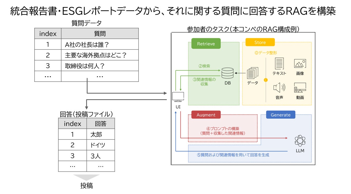 そこで、本コンペティションでは、企業のESGレポートや統合報告書に関連する質問に対して自動的かつ正確に回答できるRAGシステムの構築を目指します。