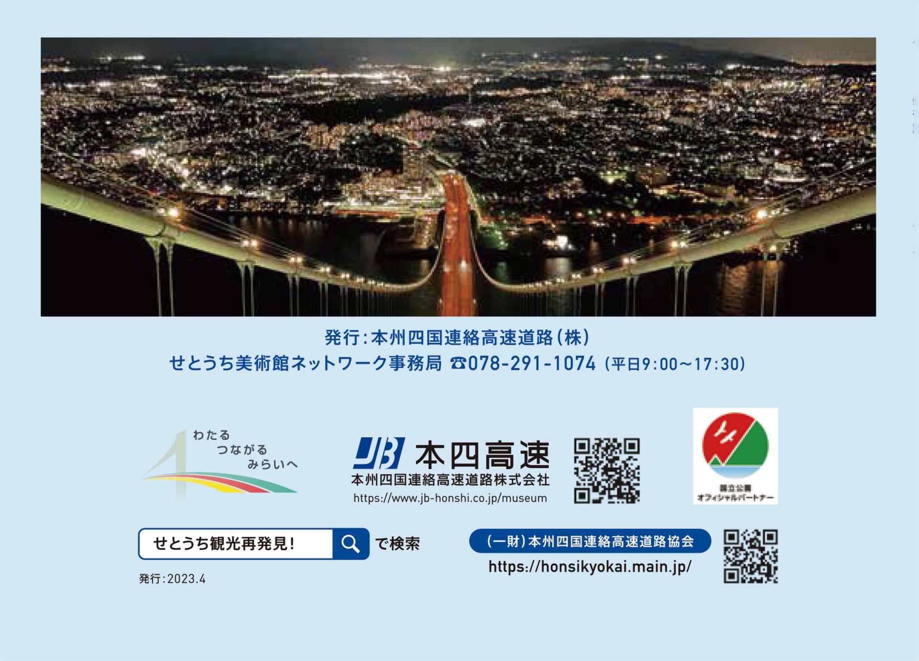 ※「せとうち美術館ネットワーク」とは、瀬戸内企業であるJB本四高速が、美術館や博物館など文化芸術施設を相互にネットワーク化し、瀬戸内地域の交流促進と活性化を図ること等を目的とした事業です。今後も、 事業の内容充実に努め、地域全体の文化芸術面の魅力の発信を支援していきます。
