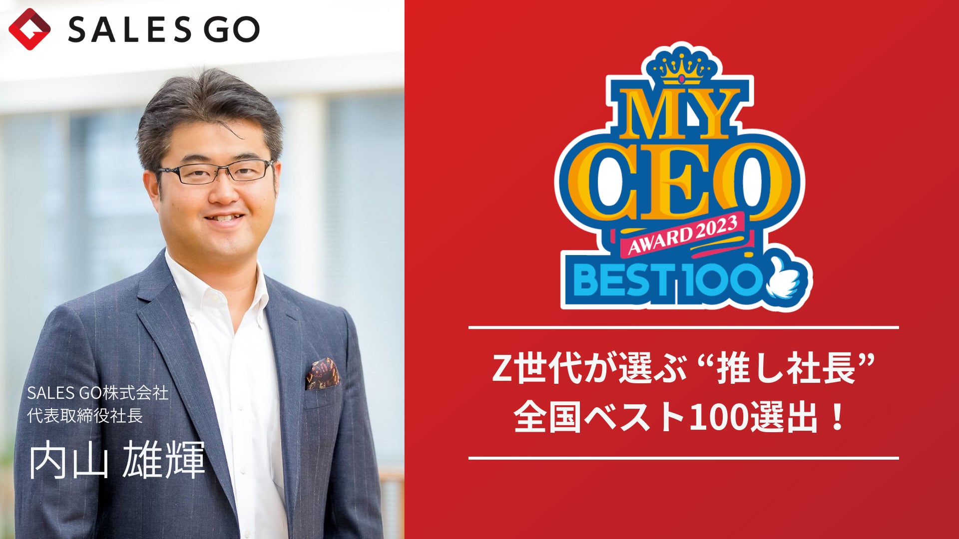SFA※1とインサイドセールスで営業のデジタル化と売上アップを支援するSALES GO株式会社(セールスゴー/所在地:東京都品川区/代表取締役社長:内山 雄輝)は、代表取締役社長の内山 雄輝がZ世代の"推し社長"を選ぶ新しい形のアワード『MY CEO AWARD 2023』において、全国BEST100に選出されたことをお知らせします。