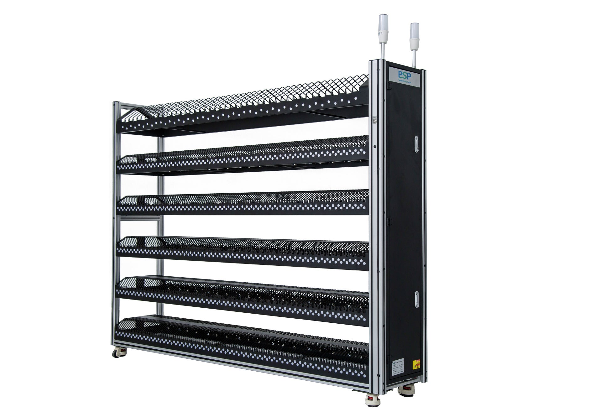 スマートリールラックは、電子部品収納ラックをデジタル化し、LEDによる直感的なリール位置の把握を可能にすることで、入出庫作業の効率化を実現します。