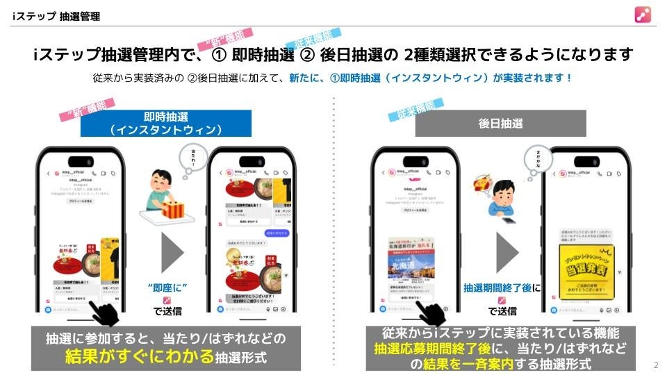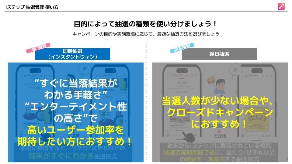 これにより、キャンペーンの目的や実施環境に応じて、iステップを活用した抽選方法を選べるようになります。
