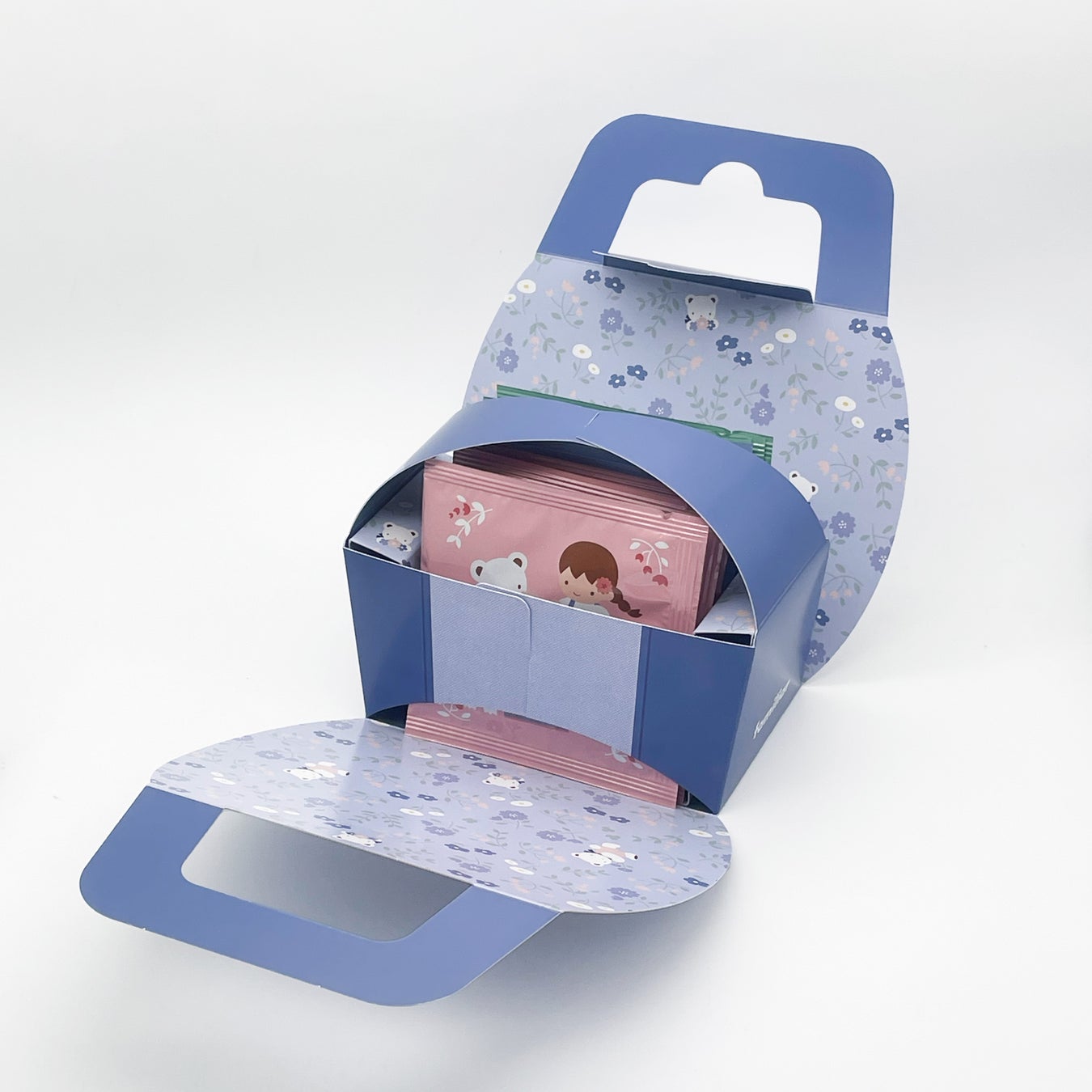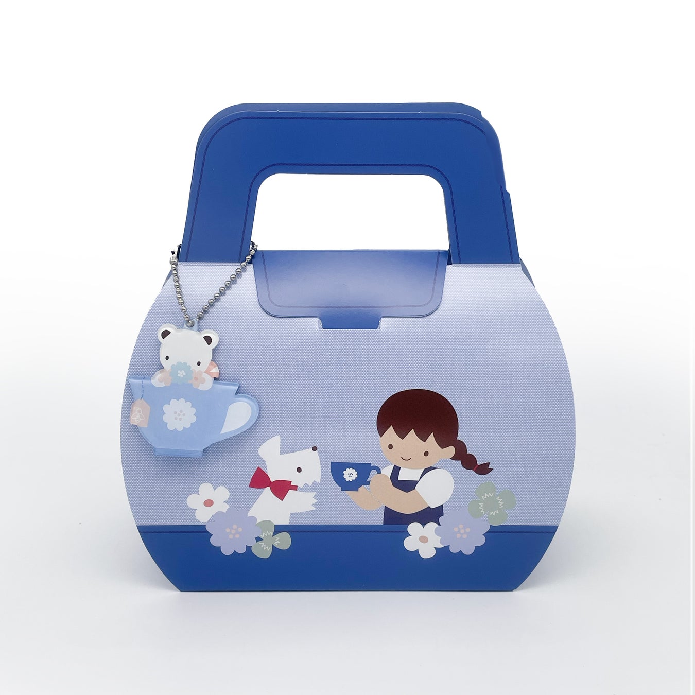 デニムの生地をイメージしたバッグ型のBOXは、内側がクマちゃんとお花の総柄になっていてとても華やかです。ティーカップの中からお花を持ったクマちゃんがのぞいているチャーム付き。チャームはお持ちのバッグなどに取り付けてご使用いただけます。