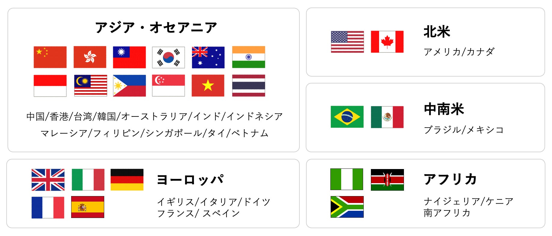 これまでアジアを中心に21カ国に対応していましたが、「スペイン」「南アフリカ」「ナイジェリア」「ケニア」が追加され、ヨーロッパの調査対象国拡大とアフリカへの調査が可能になりました。