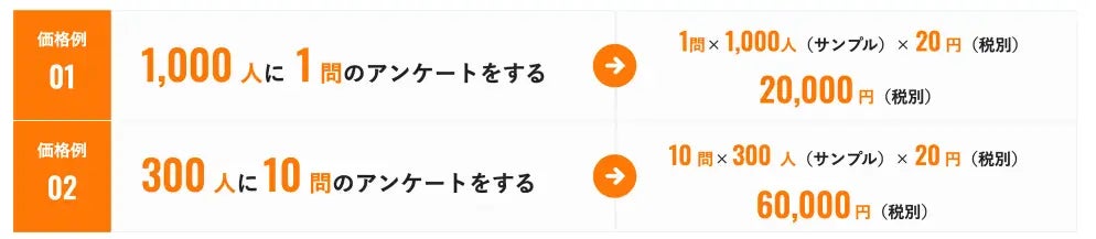 ※「日本国内モニターへのアンケート」は「1問×1s(回収)×10円(税別)」、最低ご利用金額10,000円~(税別)でご利用可能です。(使用するアンケート作成機能によって金額が「1問×1s×15円(税別)」になります。)