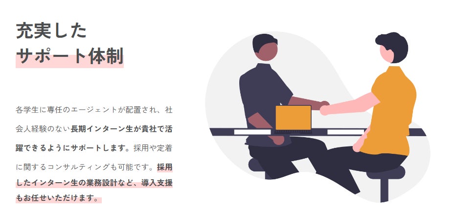 各学生に専任のエージェントを配置し、社会人経験のない長期インターン生が企業で活躍できるようサポートします。採用や定着に関するコンサルティングも提供し、インターン生の業務設計など、導入支援もお任せいただけます。