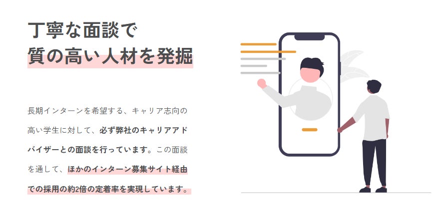キャリアアドバイザーが学生一人ひとりと面談を行い、それぞれの適性や希望に合った企業を紹介しています。このきめ細やかなマッチングにより、他のインターン募集サイト経由での採用と比較しても高い定着率を実現しています。