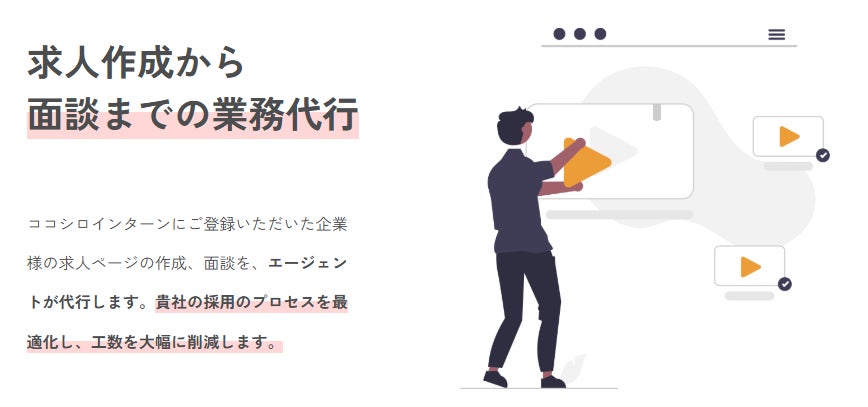 企業様の求人ページ作成や学生との面談をエージェントが代行し、採用プロセスの効率化と工数削減をサポートします。