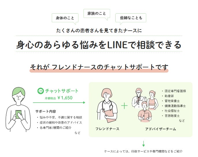 フレンドナースを窓口に他専門家(助産師、管理栄養士、保育士、健康運動指導士、社会福祉 士、緩和ケア認定看護師)と協働して身心不調の改善とその要因の解決のための医療福祉機関や社会資源へコーディネートします。7時~21時まで相談対応を実施(相談受付は24時間)※緊急時は担当ナースが判断します。