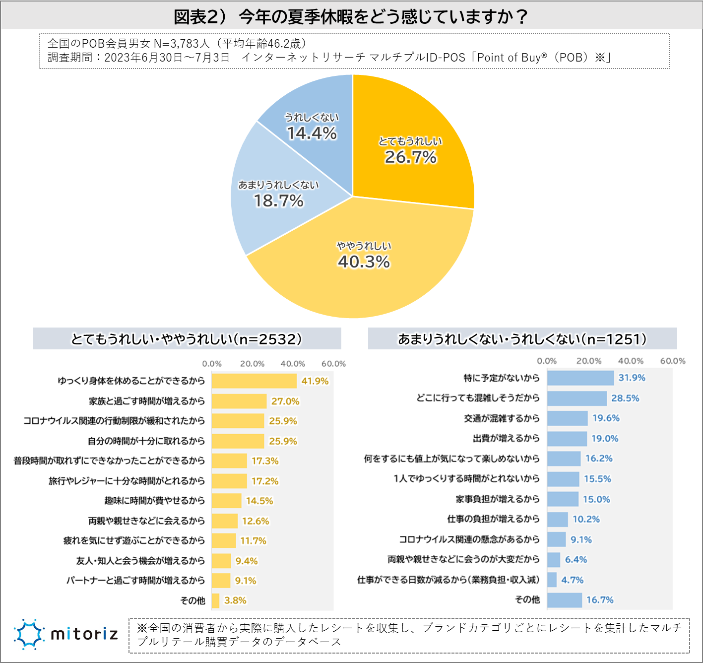 7割がお盆休み・夏季休暇を嬉しく感じており、最も多い理由は「ゆっくり身体を休めることができる」