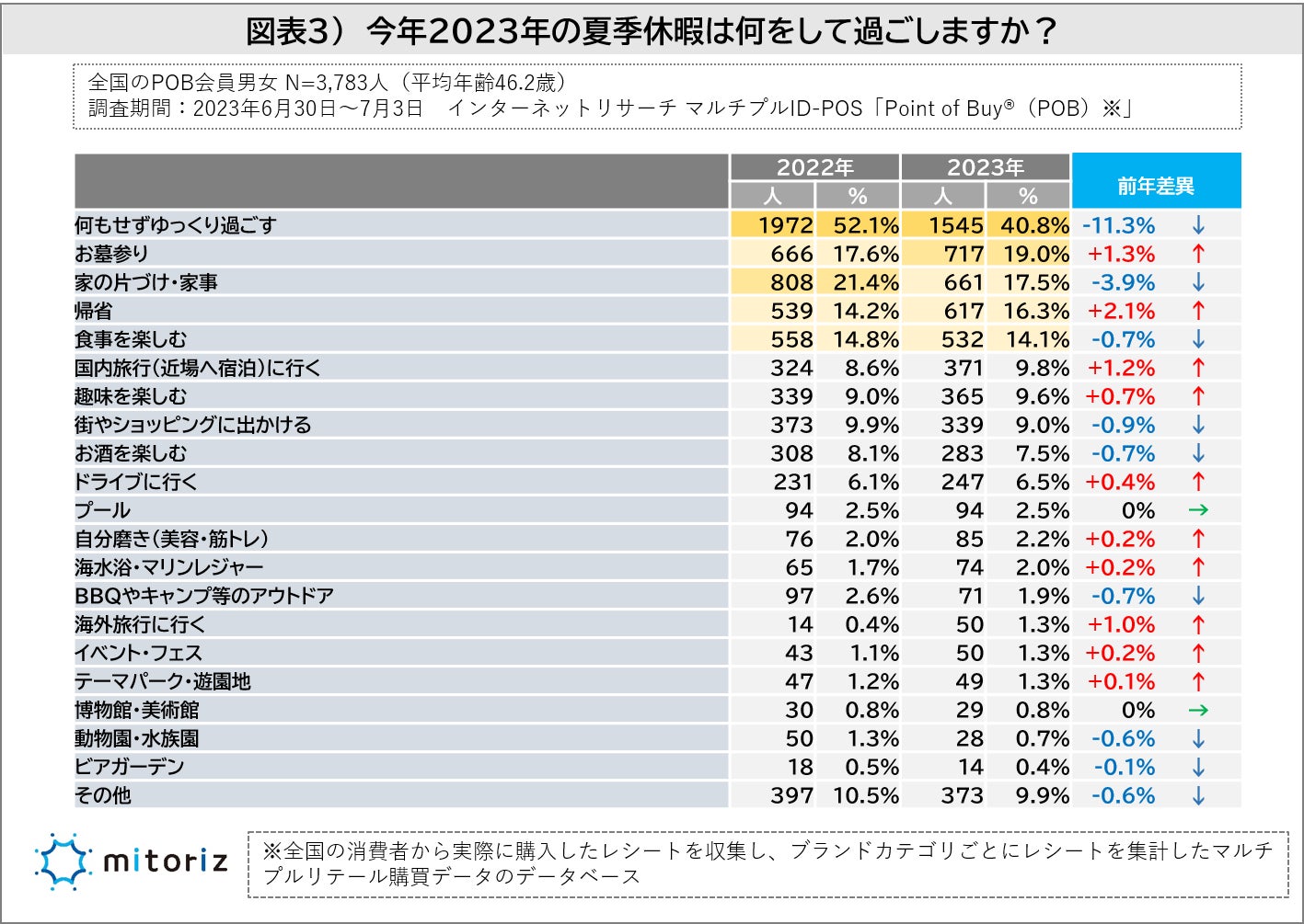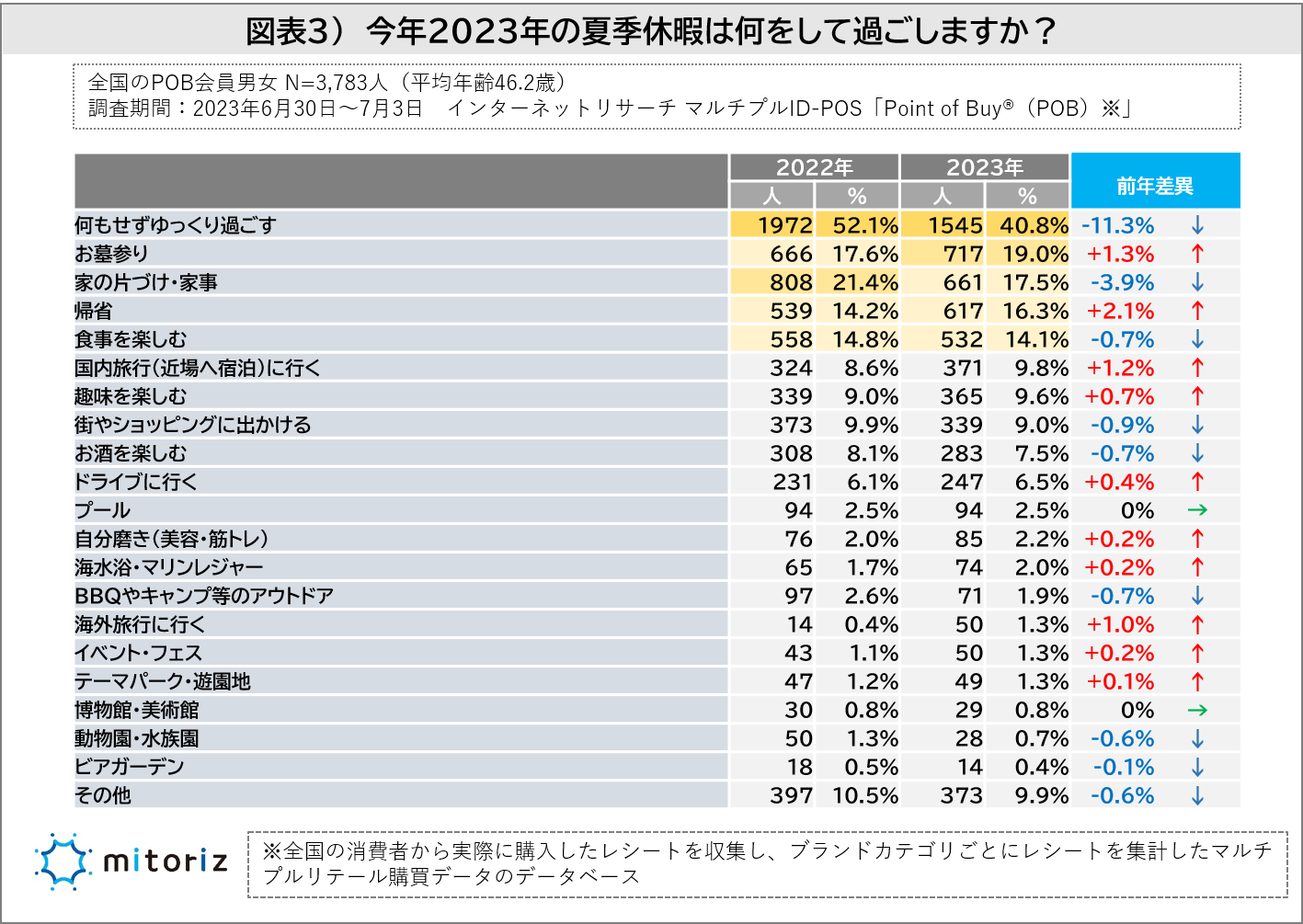 続いて、お盆休み・夏季休暇の過ごし方を昨年の過ごし方と合わせて尋ねました。昨年と同様「何もせずゆっくり過ごす(40.8%)」が最も多い回答でしたが、昨年と比べると11.3%減少しています。一方で、「お墓参り(+1.3%)」、「帰省(+2.1%)」といった項目の他、「国内旅行に行く(+1.2%)」、「海外旅行に行く(+1.0%)」等の外出を伴う過ごし方が上昇している傾向があります(図表3)。