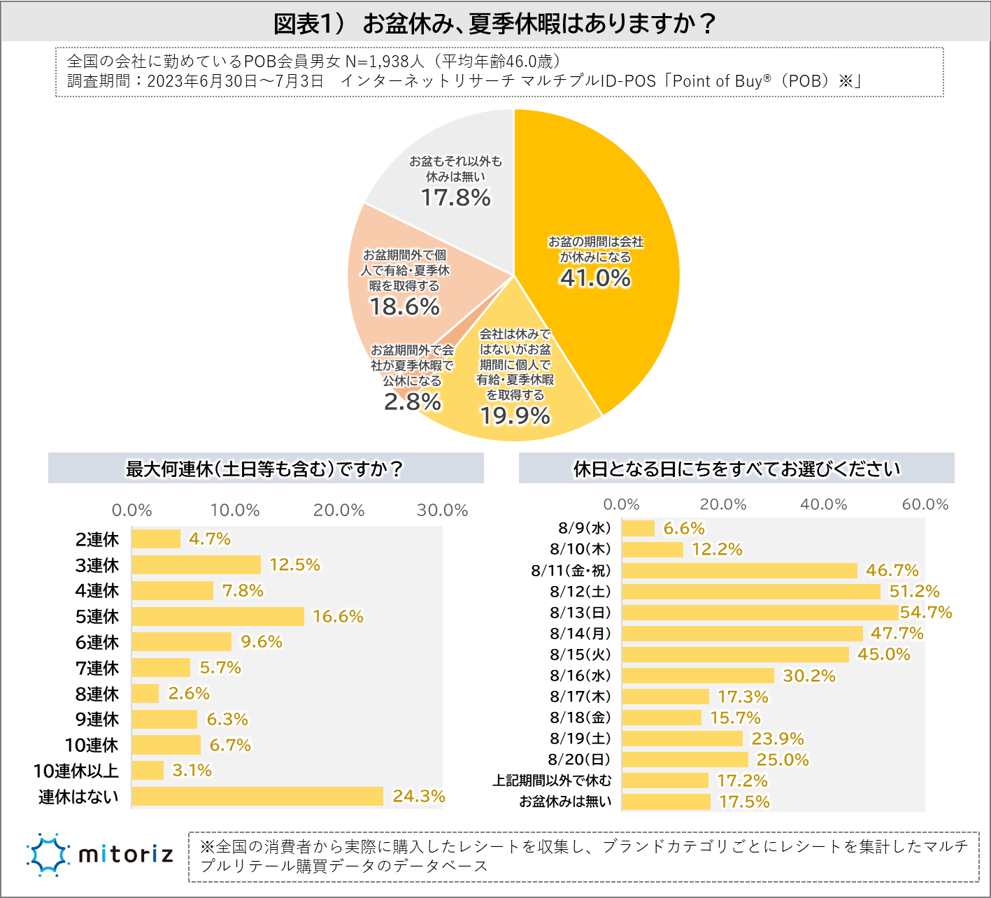 回答者の中で会社に勤めの1,938人を対象に、お盆休み・夏季休暇の取得について尋ねました。勤務先の制度としてお盆休みがあるが41.0%、個人で休みを取る人が19.9%となり、合わせて60.9%の人がお盆休みを取得予定であることがわかりました。
