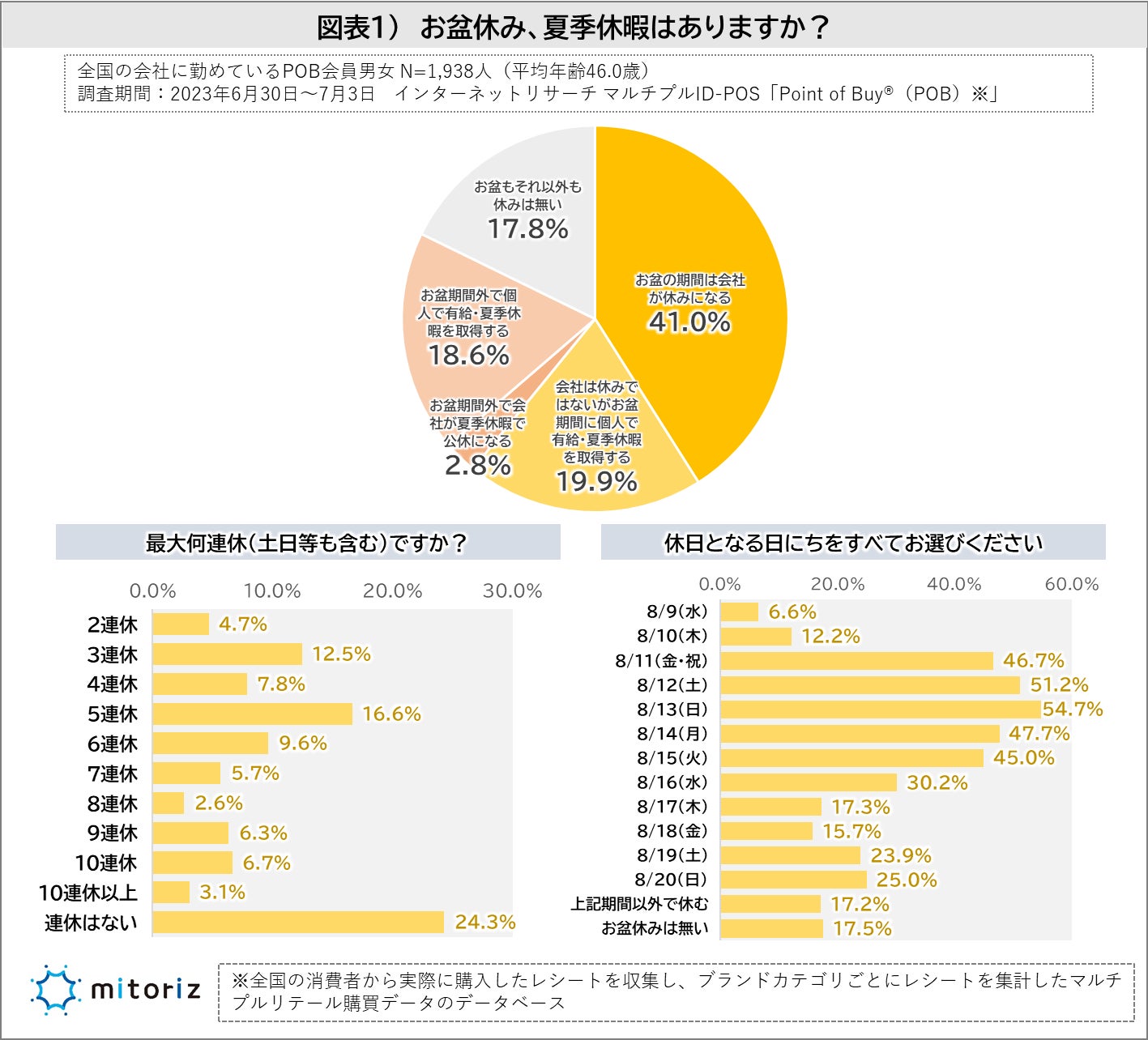 休暇期間は5連休(16.6%)が最も多く、8/11(金・祝)から8/15(火)の5日間かけて取得する人が多い傾向が出ています。2023年は10連休も取得可能と言われていますが、10連休(6.7%)、10連休以上(3.1%)で合わせて9.8%でした。また、お盆・夏季休暇は無いと回答した人が17.7%という結果となりました。