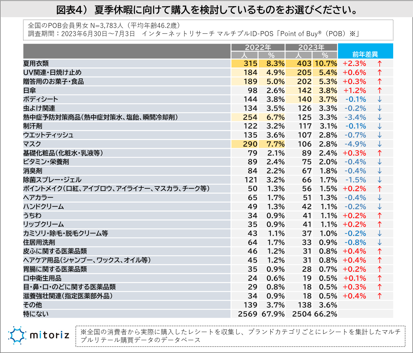 2023年は「夏用衣類(10.7%)」の回答率が最も高く、続いて「UV関連・日焼け止め(5.4%)」、「贈答用のお菓子・食品(5.3%)」という結果となりました(図表4)。